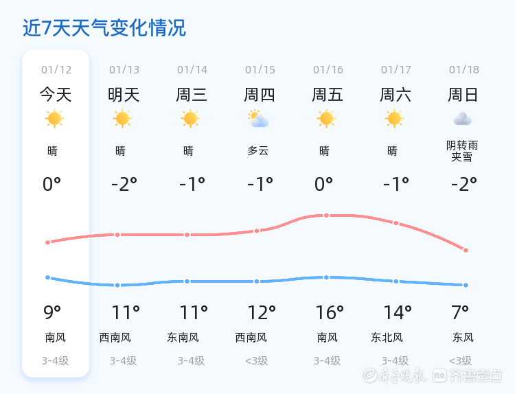 今天是2026年1月12日,星期一,农历十一月廿四。济宁市今天天气晴朗,气温范围在0℃至9℃之间,南风3级,空气湿度为35%,PM2.5指数为59。各区天气情况基本一致,均为晴天,温差较大,市民需注意早晚保暖。