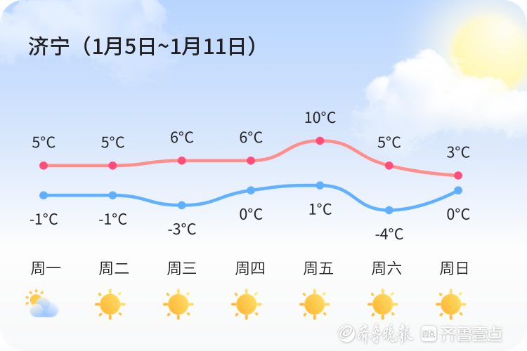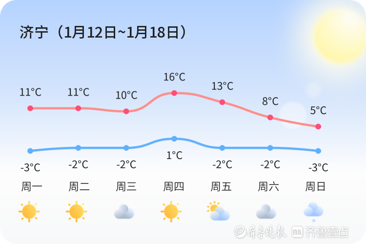 全市周平均最高温10℃,平均最低温-1℃,平均气温4℃,周最高气温16℃,出现在周四,周最低温-3℃,出现在周一、周日。