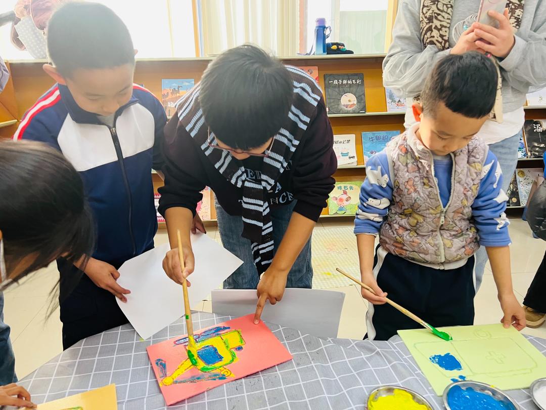 故事讲罢,活动进入了创意手工环节。赵永丽拿出了预先准备好的各种车辆版画模板,并分发了水彩颜料、画笔和纸张。在她的耐心示范和指导下,孩子们兴致勃勃地挑选起自己喜爱的“小车”,用画笔蘸上各色颜料,细心地涂刷在版画上。随后,他们将涂满颜料的版画小心翼翼地翻转、按压在纸上,再轻轻揭开——一辆辆色彩鲜艳、形象稚拙的小汽车、大卡车、压路车便跃然纸上,每一幅转印作品都独一无二,充满了童真与创意。