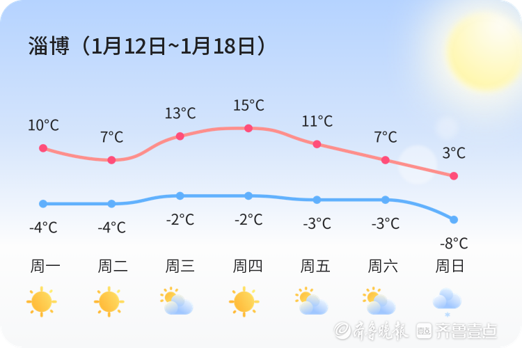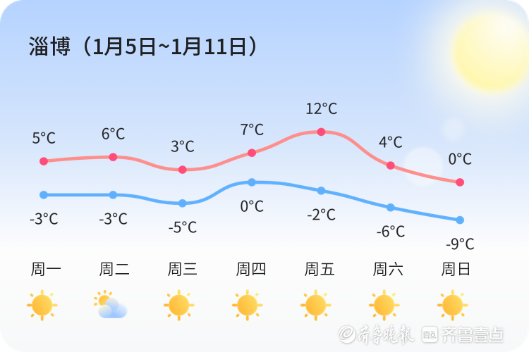 上周(1月5日~1月11日)我市晴天比较多。全市周平均最高温5℃,平均最低温-4℃,平均气温0℃,周最高气温12℃,出现在周五,周最低温-9℃,出现在周日。具体气温变化情况如下图。本周总体以晴、多云为主基调,可能还会有雨等天气。具体天气情况请关注每日天气情况预告。本周气温变化情况:最低气温-8~-2℃,最高气温3~15℃。需要关注及时最新预报。具体气温变化情况如下图。