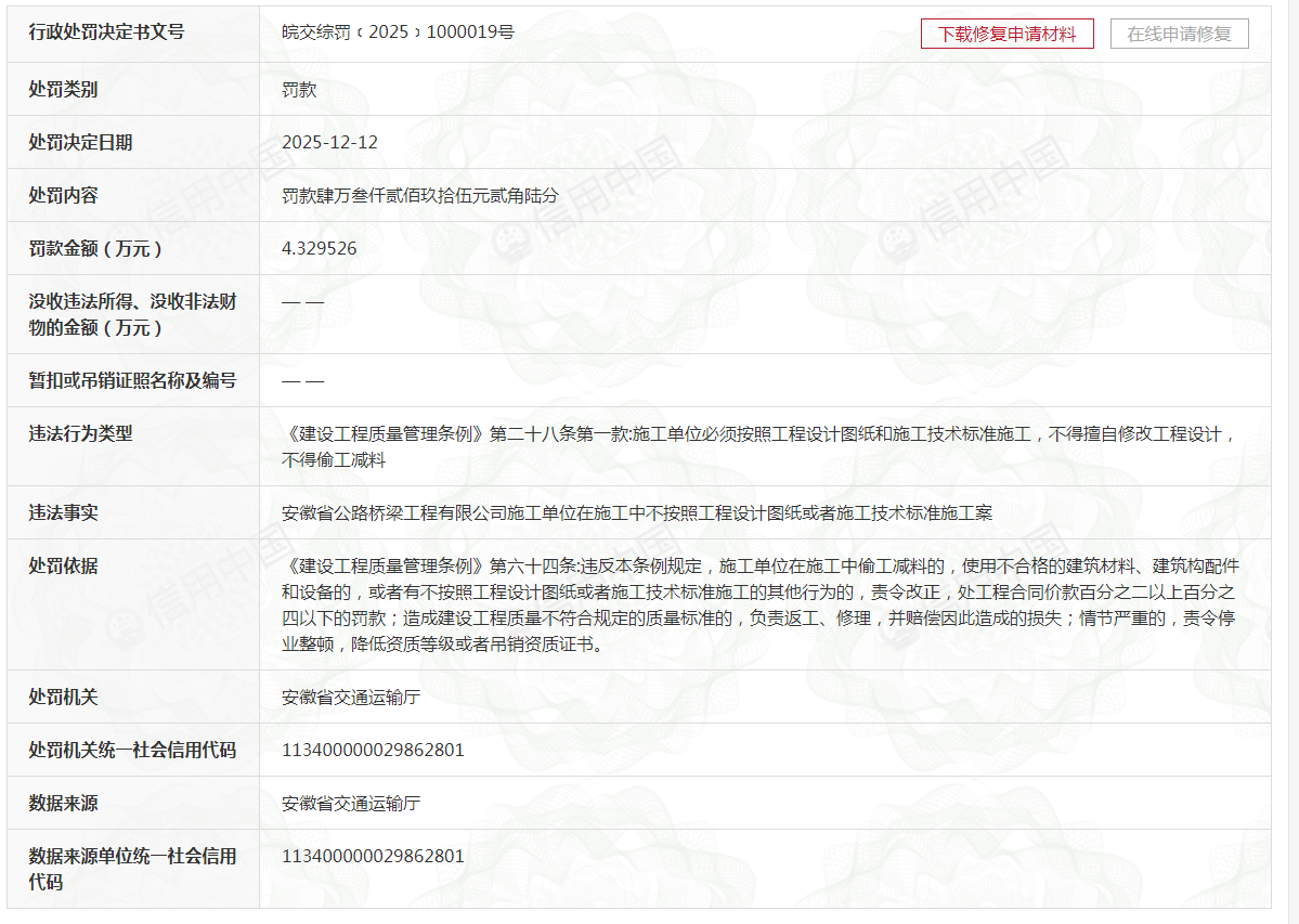依据《建设工程质量管理条例》相关规定,安徽建工公路桥梁建设集团有限公司被罚款4.329526万元。