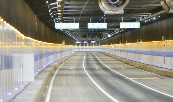 隧道内部的沥青路面铺设和交通标志线施划已经全部完成,道路两侧墙体安装有白色和蓝色相间的防火装饰板,顶部安装有可24小时照亮的LED照明灯及条形装饰灯。