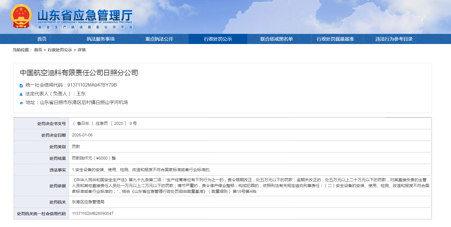 日前,山东省应急管理厅公示了中国航空油料有限责任公司日照分公司的行政处罚决定。处罚决定书文号(鲁日东)应急罚[2025〕9号显示,中国航空油料有限责任公司日照分公司的违法事实为1.安全设备的安装、使用、检测、改造和报废不符合国家标准或者行业标准,依据《中华人民共和国安全生产法》相关规定,中国航空油料有限责任公司日照分公司被罚6000元。
