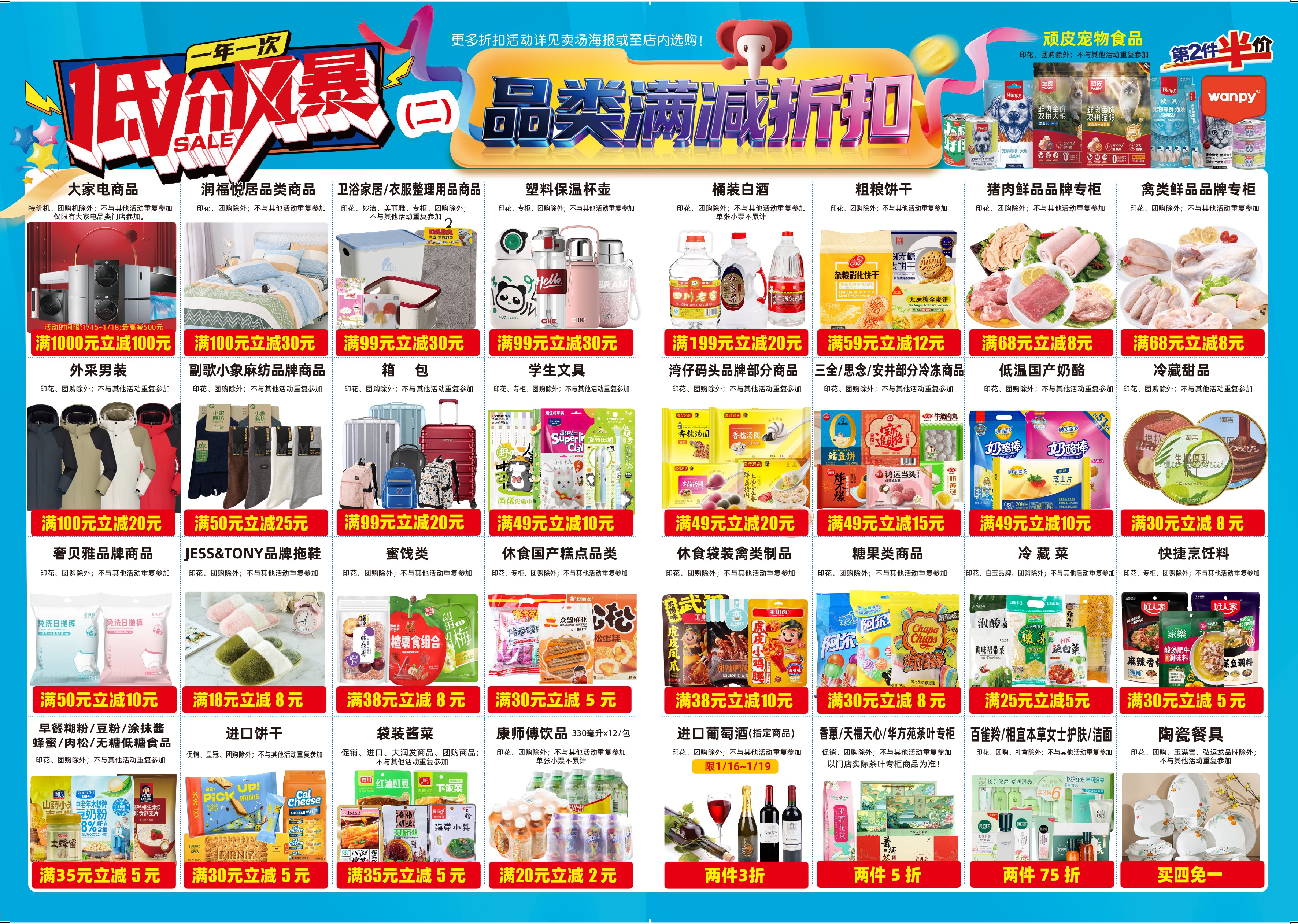 针对不同消费需求,大润发推出“品类满减+折扣”组合拳,让省钱更有方向。塑料保温杯壶满99元立减30元,兼顾实用与颜值;佳节备酒的顾客,桶装白酒满199元立减20元、进口葡萄酒(指定商品)两件享3折,囤酒更划算;居家焕新的家庭,润福悦居品类商品满100元立减30元、大家电满1000元立减100元,从软装到家电一站式升级;就连零食党也能受益——粗粮饼干满59元立减12元、蜜饯类满38元立减8元,追剧小食轻松囤够。满减规则清晰透明,叠加会员权益后,“省上加省”成为常态。