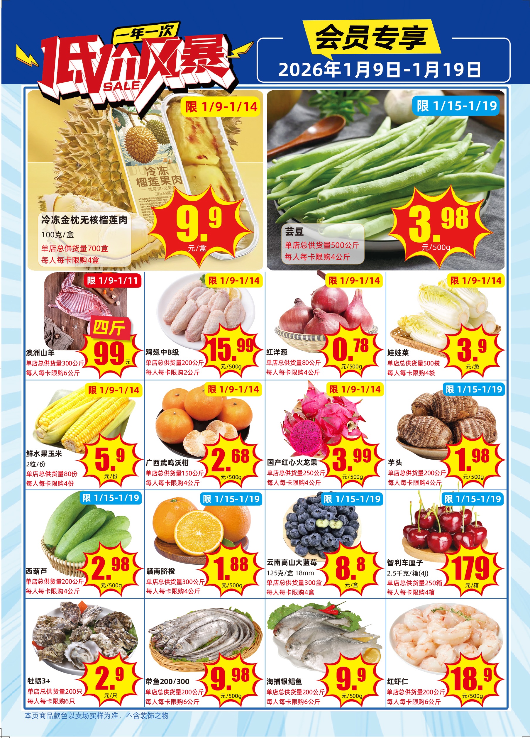应季蔬果的低价直供,让“菜篮子”拎得更轻快。大润发此次聚焦“鲜”与“省”,冷冻金枕无核榴莲肉仅9.9元/盒,让榴莲爱好者实现“自由”;广西武鸣沃柑2.68元/500g、赣南脐橙1.88元/500g,酸甜多汁的柑橘类水果成为冬日补水首选;云南高山大蓝莓8.8元/盒、智利4J车厘子(2.5千克/箱)179元/箱,高端水果也放下“身段”。就连家常配菜如西葫芦2.98元/500g、红洋葱0.78元/500g,都以“地板价”守护烟火气,让每一餐都新鲜又划算。