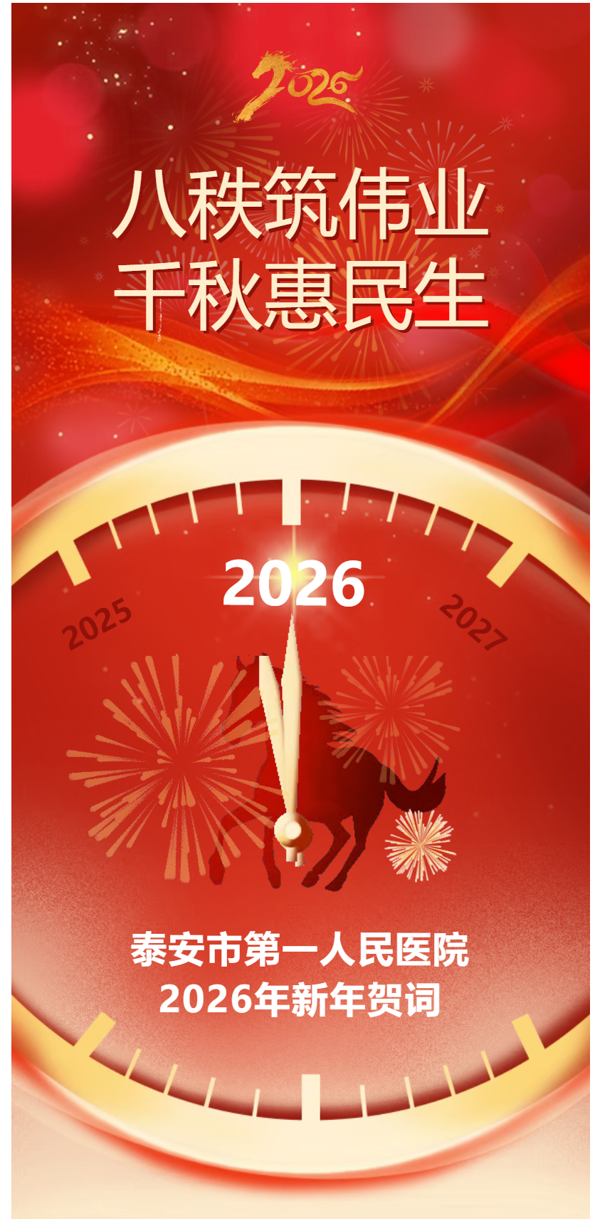 岁序常易,华章日新。在这辞旧迎新的美好时刻,我们满怀喜悦与期待,迎来了充满希望的2026年。在这新年的美好时刻,泰安市第一人民医院党委班子向一直以来关心和支持医院发展的各级领导、社会各界朋友,向辛勤工作、无私奉献的全院职工,向为医院发展作出贡献的离退休老同志,向默默支持医院工作的职工家属,以及信任我们的广大患者朋友们,致以最诚挚的问候和最美好的祝福!