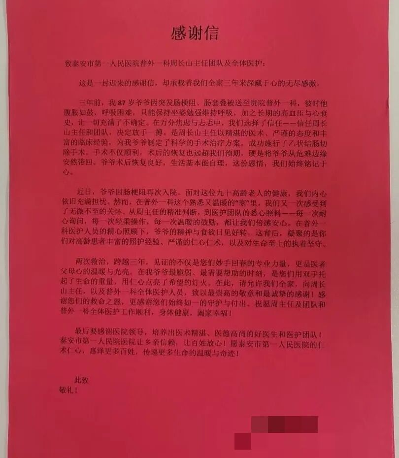 两次救治,跨越两年,见证的不仅是您们妙手回春的专业力量,更是医者父母心的温暖与光亮。在我爷爷最脆弱、最需要帮助的时刻,是您们用双手托起了生命的重量,用仁心点亮了希望的灯火。在此,请允许我们全家,向周长山主任,以及普外一科全体医护人员,致以最崇高的敬意和最诚挚的感谢!感谢您们的救命之恩,更感谢您们始终如一的守护与付出。祝愿周主任及团队和普外一科全体医护工作顺利,身体健康,全家幸福!
