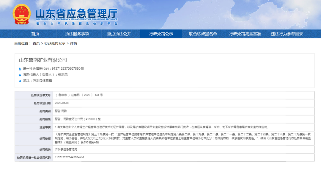 齐鲁晚报·齐鲁壹点记者于山东省应急管理厅行政处罚公示栏了解到,1月5日,山东鲁南矿业有限公司(下称“鲁南矿业”)收到罚单,处罚机关为沂水县应急管理局。