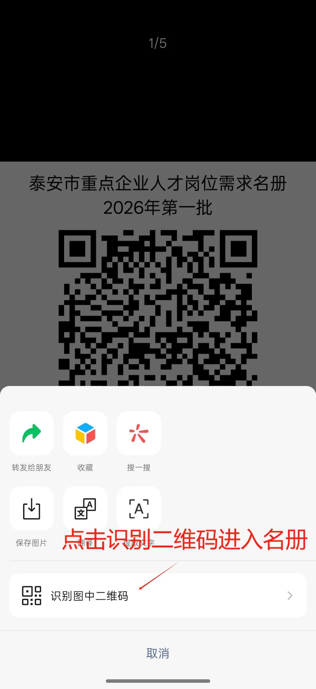 长按识别二维码进入名册页面,选择右上角的下拉按钮,弹出下拉菜单。