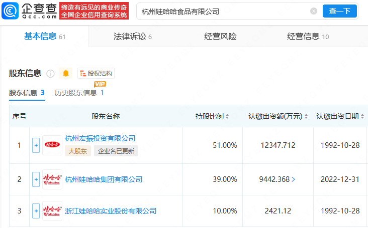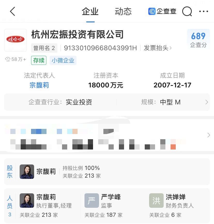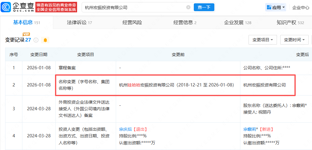 企查查APP显示,近日,杭州宏振投资有限公司发生工商变更,公司名称从杭州娃哈哈宏振投资有限公司变更为杭州宏振投资有限公司。企查查显示,杭州宏振投资有限公司成立于2007年12月,注册资本1.8亿元,宗馥莉为唯一股东并担任法定代表人、执行董事、经理职务。股权穿透显示,该公司为杭州娃哈哈食品有限公司第一大股东,持股比例为51%。(企查查)