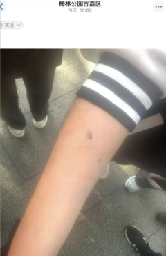 贾杰(梅林公园项目经理):现场我们的工作人员第一时间对小孩进行安抚,通知家长到现场来,赶快到就近医院打疫苗。