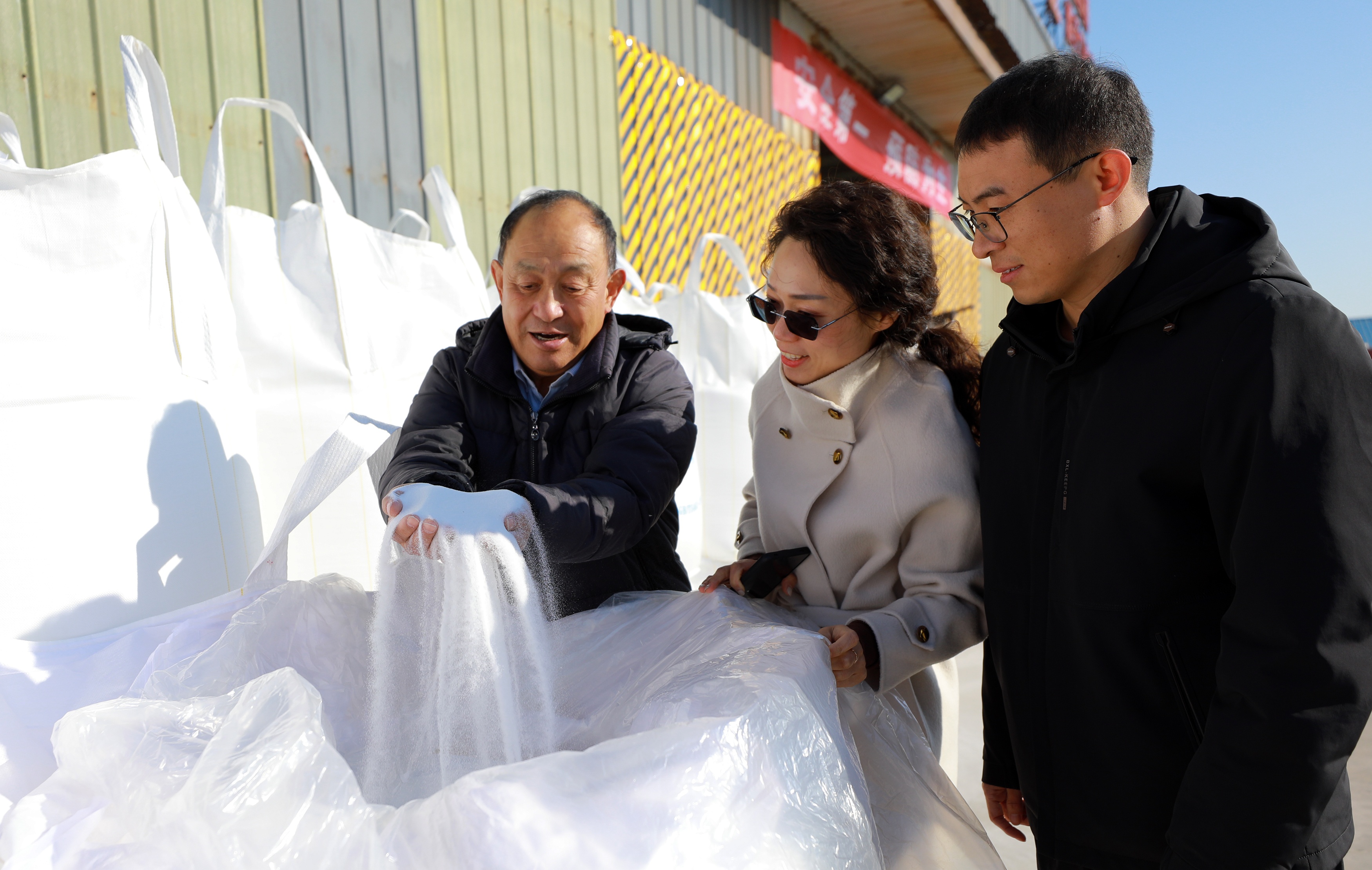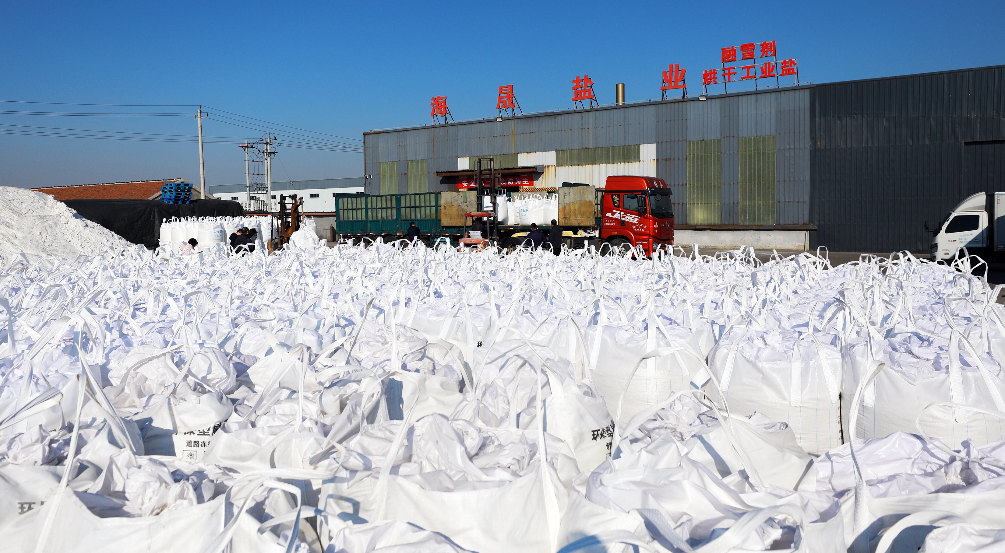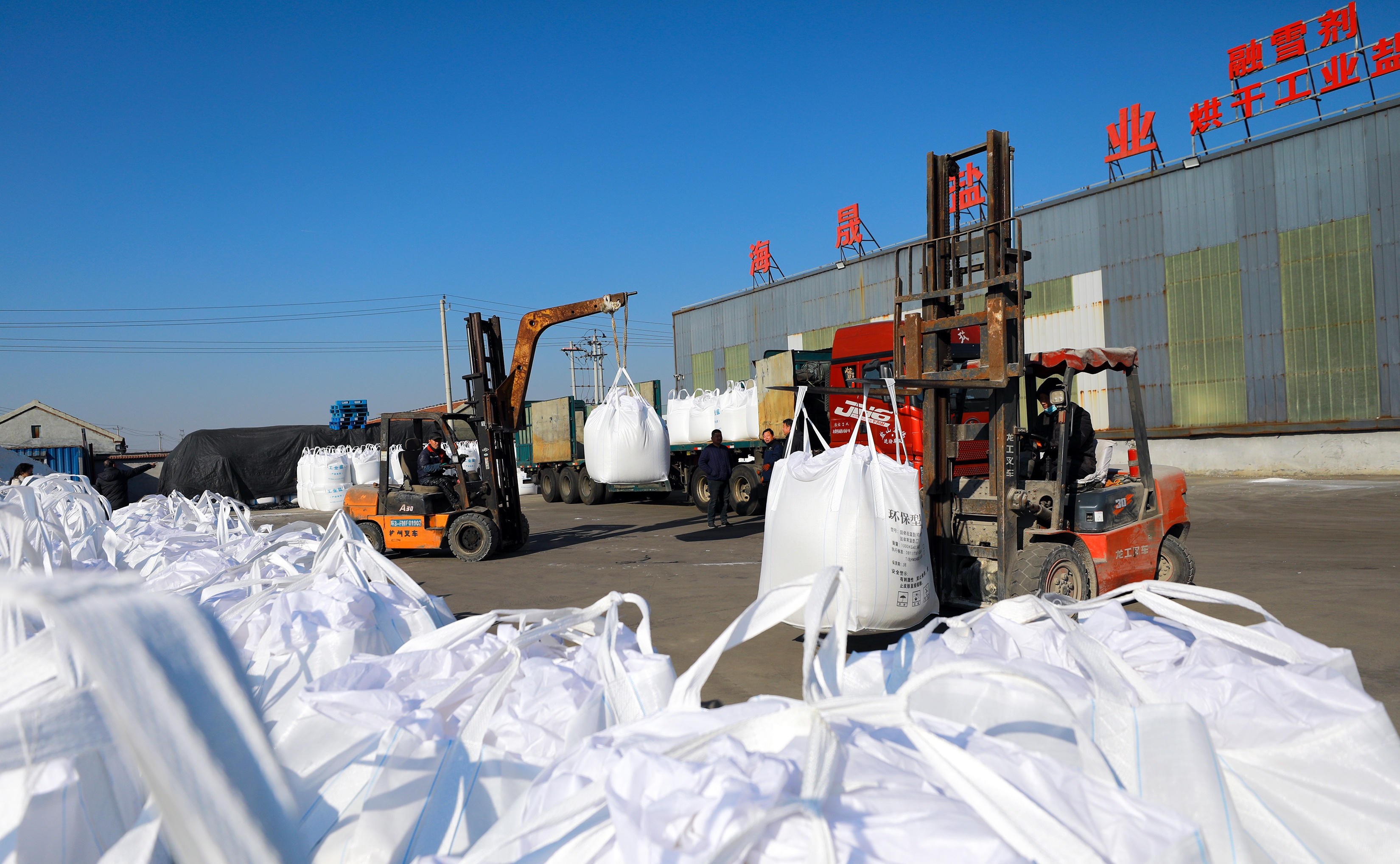 近日,在滨州市无棣县碣石山镇的山东海晟盐业有限公司院内,工人们正忙着把成吨的融雪剂装上货车,准备发往北京。目前,该公司1月份订单已超1000万元,工人们加班加点忙生产。