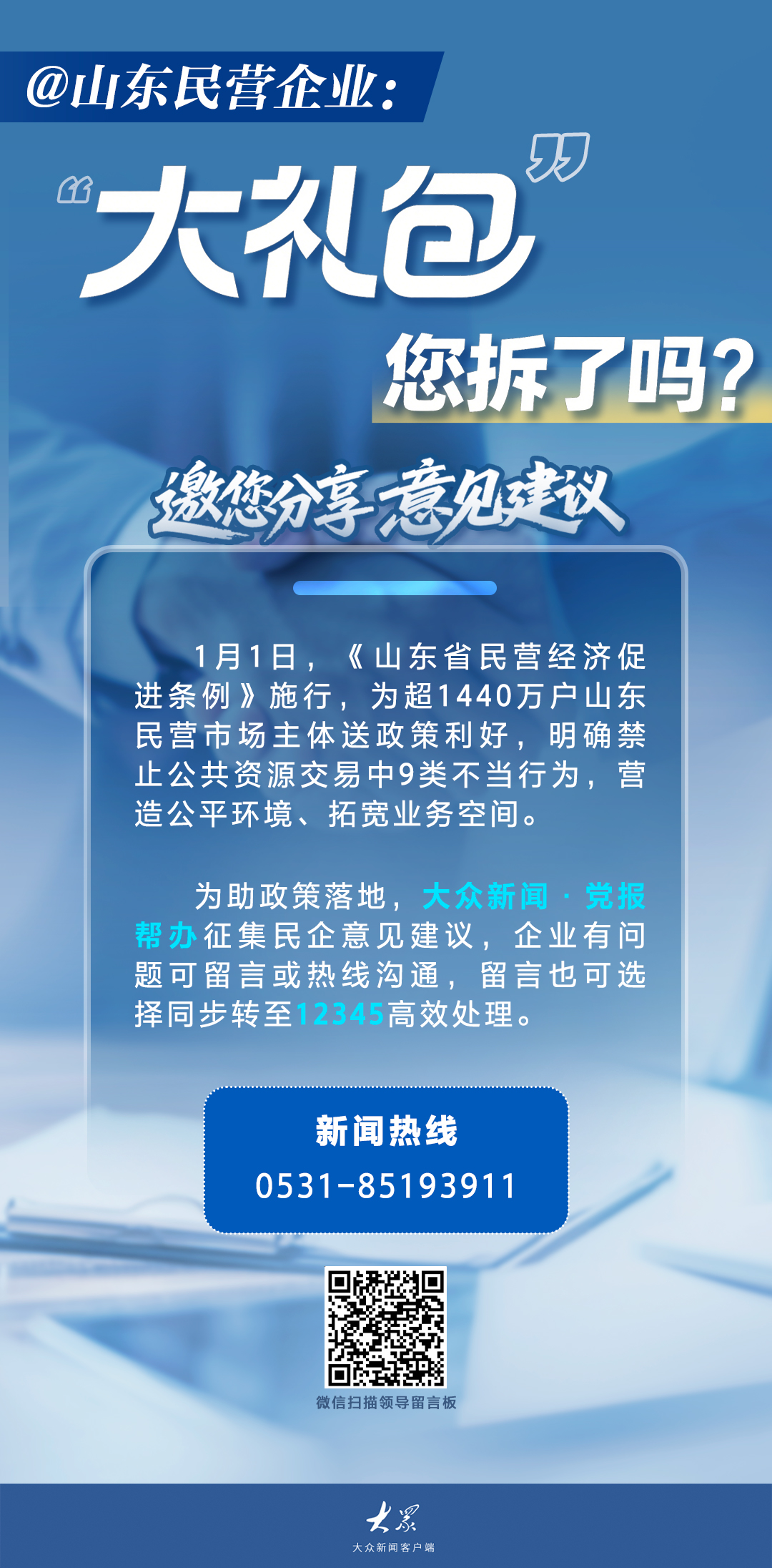 为助力政策更好落地,大众新闻·党报帮办现面向广大民营企业征集意见建议,在条例落地实施过程中您的企业有任何问题和困惑均可给我们留言或拨打热线电话沟通。