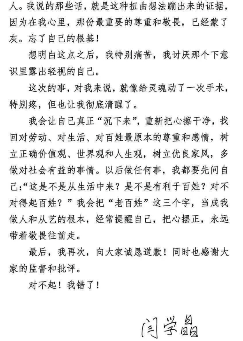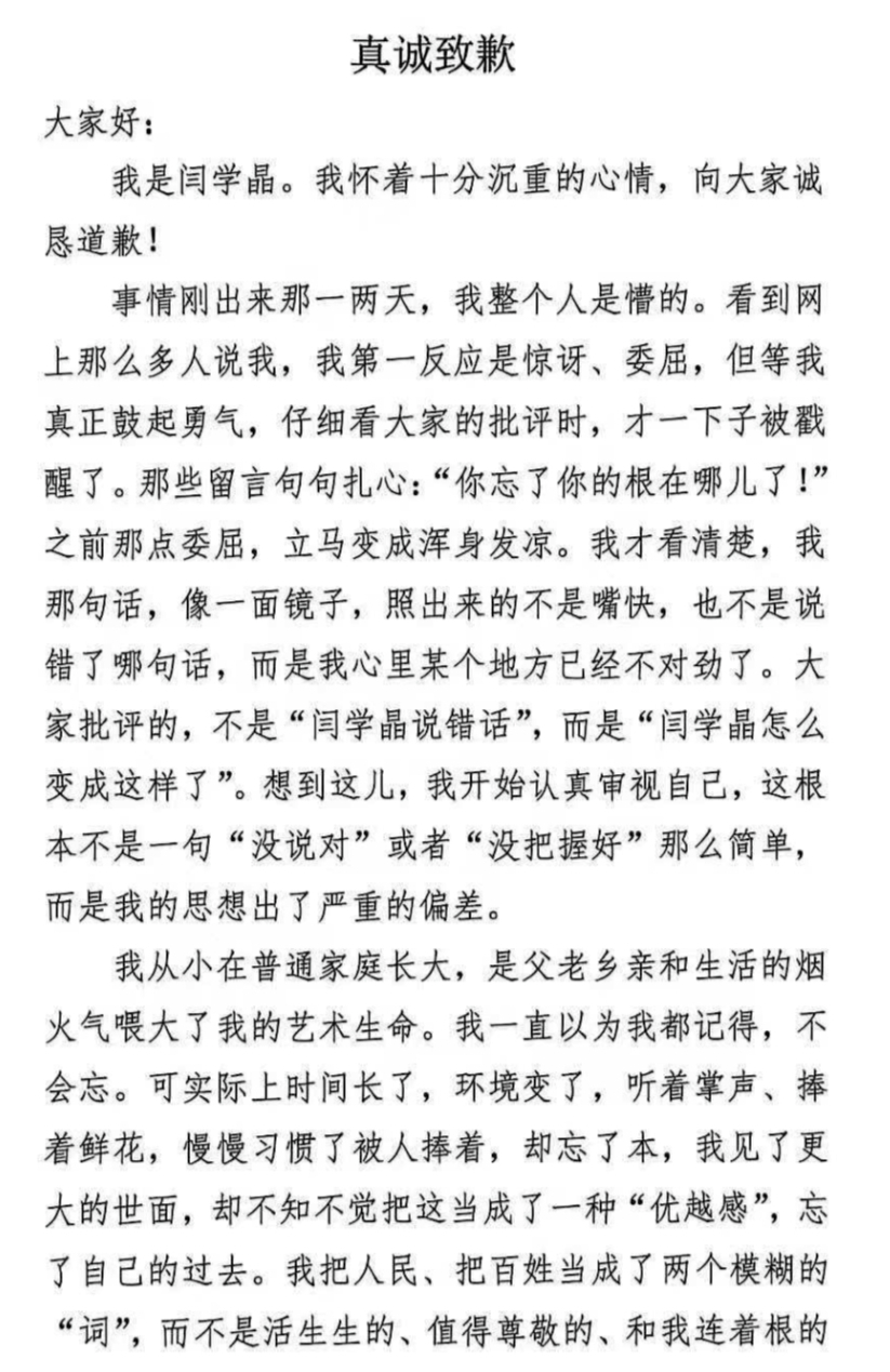 面对不断升级的舆论,闫学晶最终在1月11日晚通过朋友圈发文致歉。在道歉信中,她坦言自己“思想出了严重的偏差”,反思了自己“习惯了被人捧着,却忘了本”的心路历程。