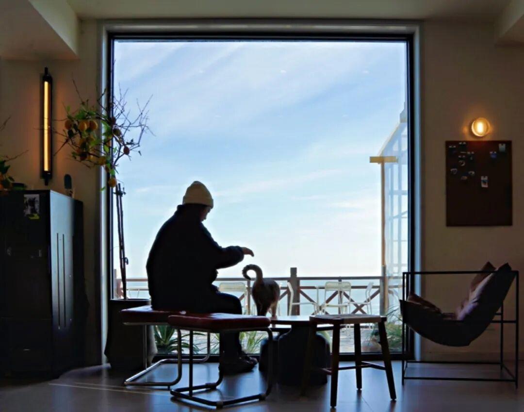 店内有一面正对大海的落地窗。坐在窗前,望向窗外,碧波与松林仿佛构成了一幅天然油画。伸手逗逗店主可爱的猫咪,生活的烦扰似乎也随之消散。