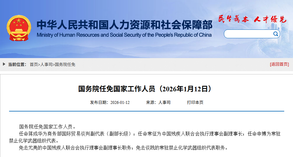 国务院任免国家工作人员。任命蒋成华为商务部国际贸易谈判副代表(副部长级);任命常征为中国残疾人联合会执行理事会副理事长;任命申博为常驻禁止化学武器组织代表。免去尤亮的中国残疾人联合会执行理事会副理事长职务;免去谈践的常驻禁止化学武器组织代表职务。