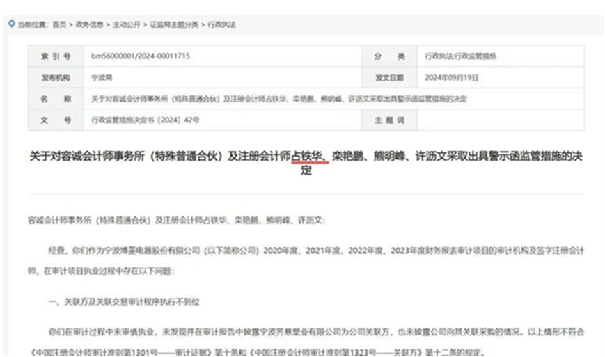 宁波证监局《关于对容诚会计师事务所(特殊普通合伙)及注册会计师占铁华、栾艳鹏、熊明峰、许沥文采取出具警示函监管措施的决定》显示,容诚会计师事务所(特殊普通合伙)及注册会计师占铁华、栾艳鹏、熊明峰、许沥文作为宁波博菱电器股份有限公司2020年度、2021年度、2022年度、2023年度财务报表审计项目的审计机构及签字注册会计师,在审计项目执业过程中存在关联方及关联交易审计程序执行不到位、预付账款审计程序执行不到位、应收账款审计程序执行不到位、管理费用审计程序执行不到位、内部控制风险评估程序执行不到位等五大问题。
