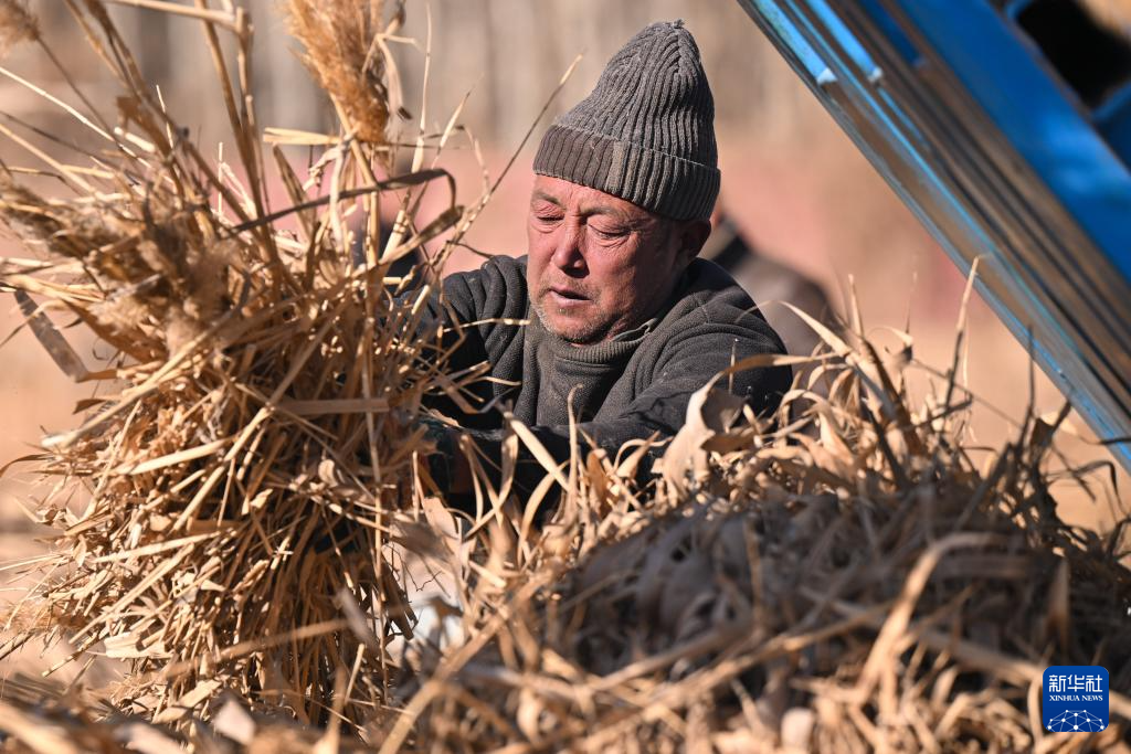 在新疆和田地区墨玉县碧玉农产品农民专业合作社,农户将收割的芦苇压制成捆(1月10日摄)。