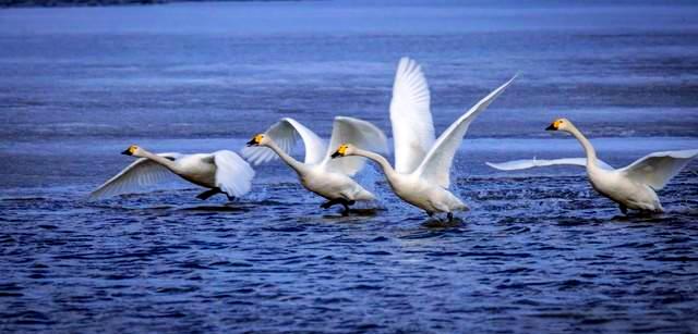 每当有人投喂,天鹅就会慵懒地过来觅食,款款漫步,徐徐而行,依然是悠然闲适。看着泰然自得的样子,谁又能想到它们是从遥远的西伯利亚远途迁徙而来的。它们穿越云层、振翅翱翔的样子,想必不会这么悠闲吧。正在这时,四只天鹅从远处奔袭而来,它们飞翔的姿势的确很美,细长的脖颈使劲拉伸,双脚平铺在尾翼下面,羽翼在空中缓缓舒展,发出轻微的呼啸。当临近沙坝,它们双脚垂放,扇动翅膀,平稳落地,娴熟优雅。