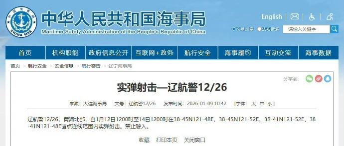 航行警告!黄海北部部分海域实弹射击中国海事局网站 2026-01-12 14:43:08据中国海事局网站消息,大连海事局发布航行警告,1月12日12时至14日12时,黄海北部部分海域实弹射击,禁止驶入。(中国海事局网站)责任编辑:房超