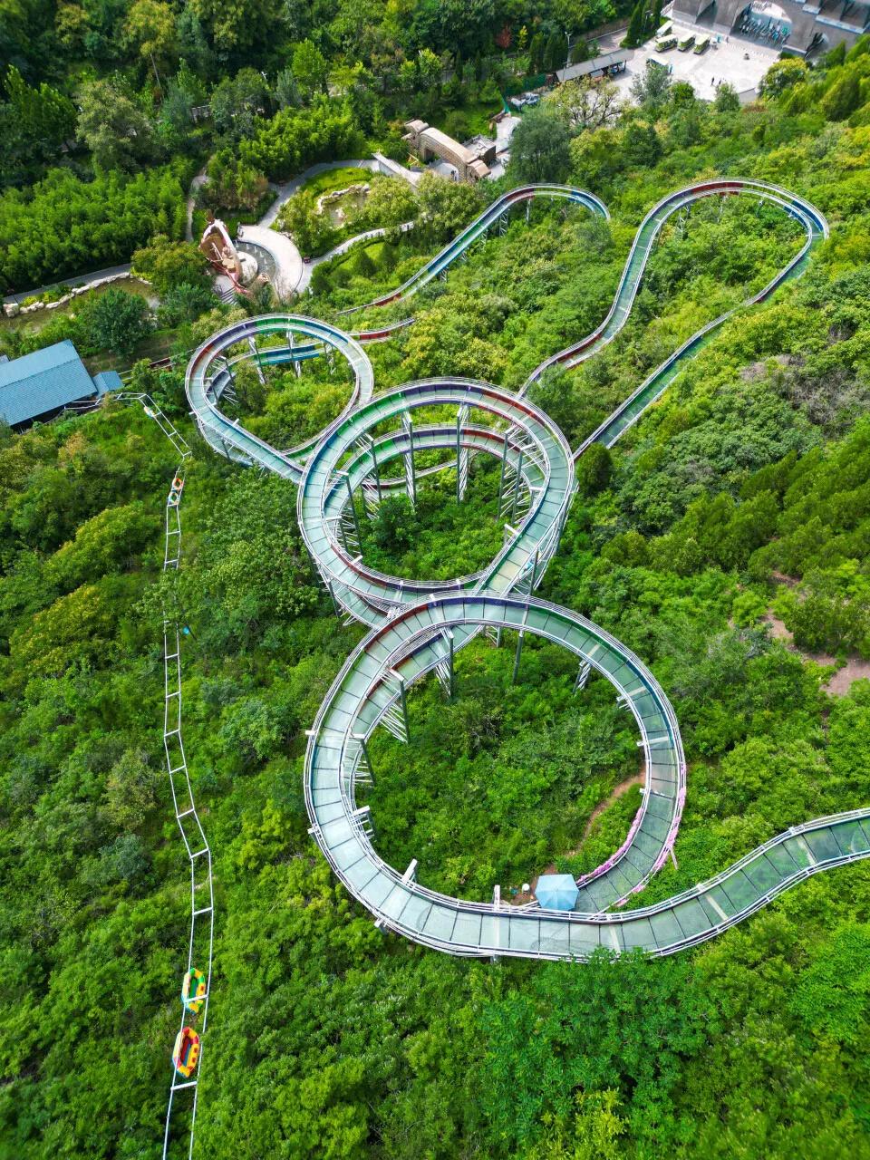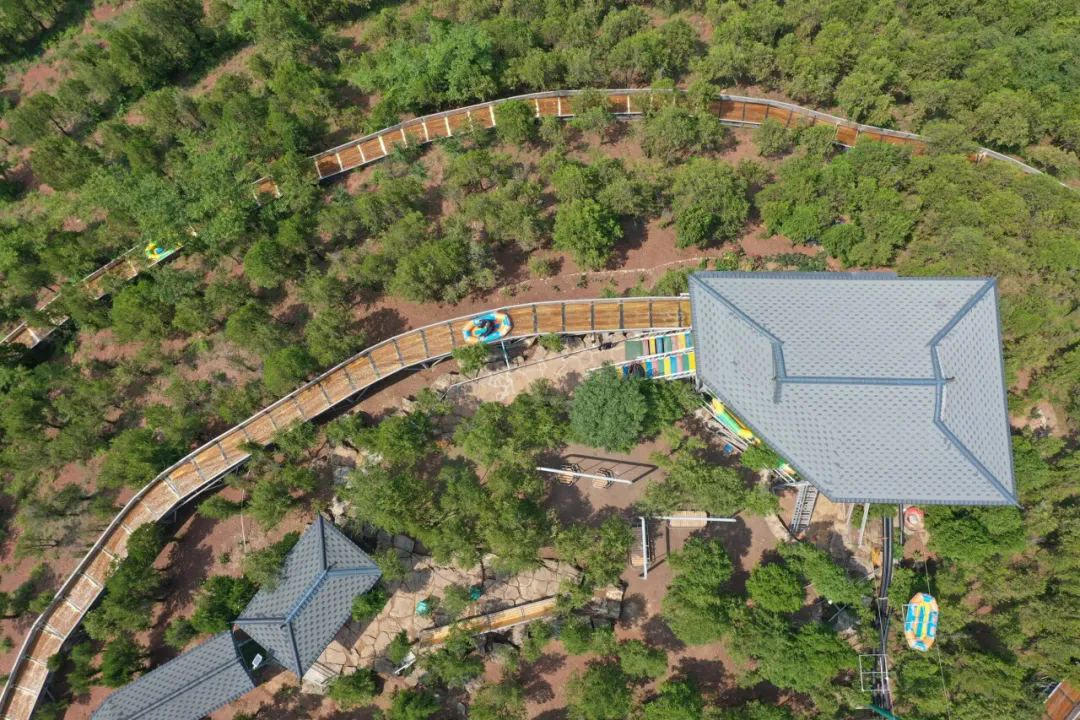 玻璃栈道的尽头便是长480米的S型玻璃滑道,如一条长龙俯身飞跃山谷。卸下攀山的疲惫,收获这超长且畅快的欢愉。