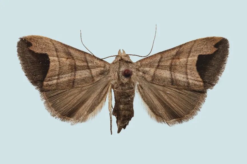 齿斑畸夜蛾。注:图片中央暗褐色圆点为标本制作工具昆虫针,并非昆虫身体结构。