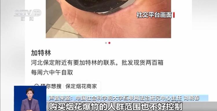 声音来源 中国社会科学院大学互联网法治研究中心主任 刘晓春:在网上交易的烟花爆竹很难监管,很难溯源,所以可能存在很多质量无法得到保障的“三无”产品,存储的时候没有规范化监管安全的配套设施,在存储和运输的过程当中,都可能因为比如挤压碰撞摩擦引发自燃爆炸,对沿途的行人车辆都会造成威胁。购买烟花爆竹的人群范围也不好控制,比如说未成年人,他也可能从网上得到烟花爆竹之后,在没有家长监督或者是缺乏安全保障条件下去进行燃放。