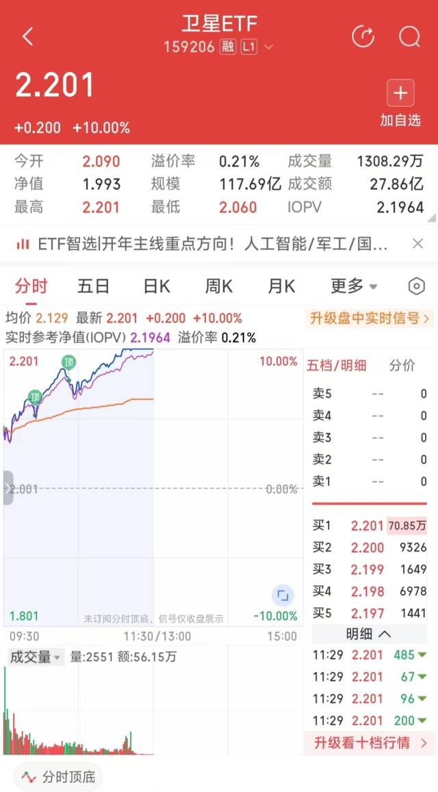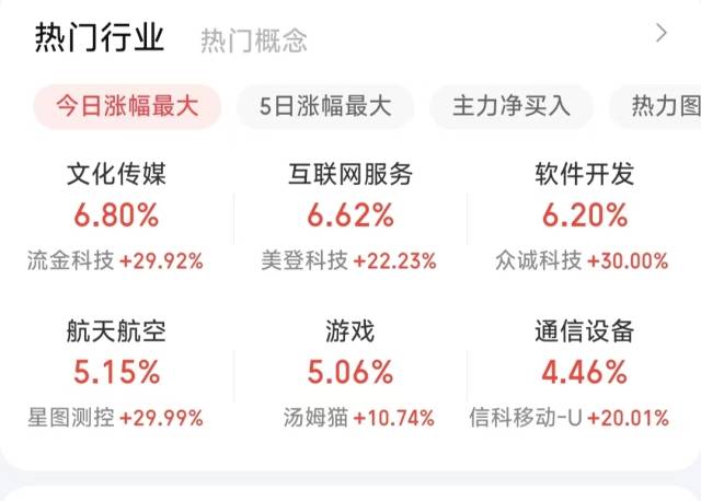 从行业看,文化传媒、互联网服务、软件开发、航空航天、游戏板块领涨,涨幅超5%。在我国提交超20万颗卫星频轨资源申请的消息利好下,卫星产业继续强势上攻,中国卫星、信科移动、天银机电等多股涨停;卫星ETF盘中涨幅超5%,永赢基金卫星ETF涨停。仅开年一周以来,多家基金公司的卫星产业主题ETF涨超20%。