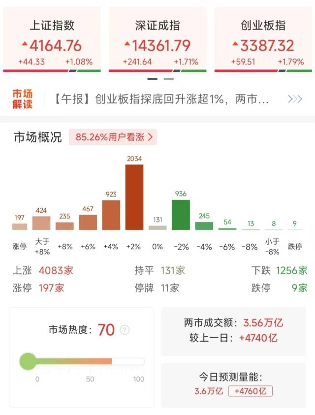 目前,沪指、深成指、创业板指均大涨约1%,市场3800多只个股上涨,涨停股超160只。人工智能、AI应用概念领涨。
