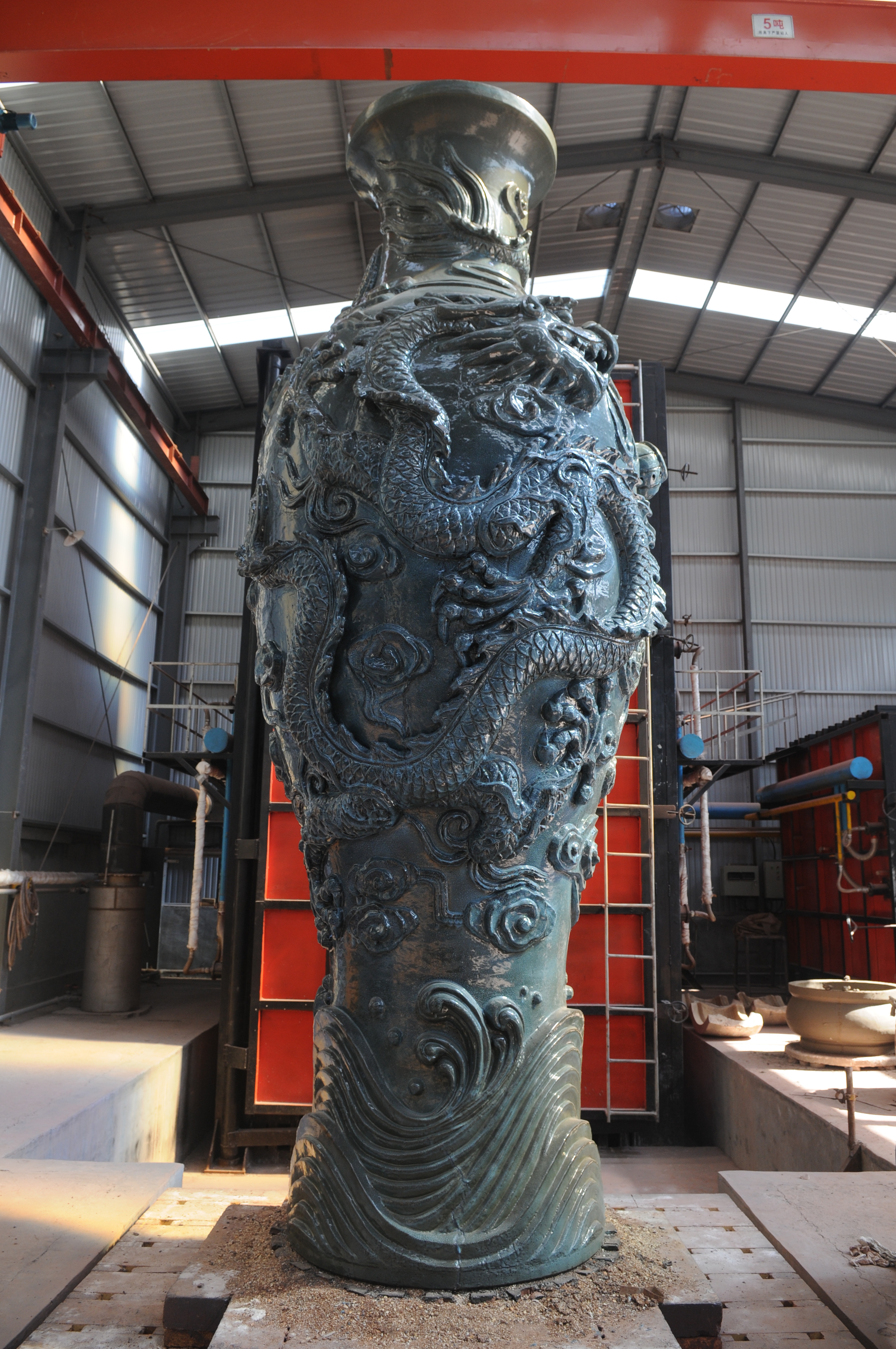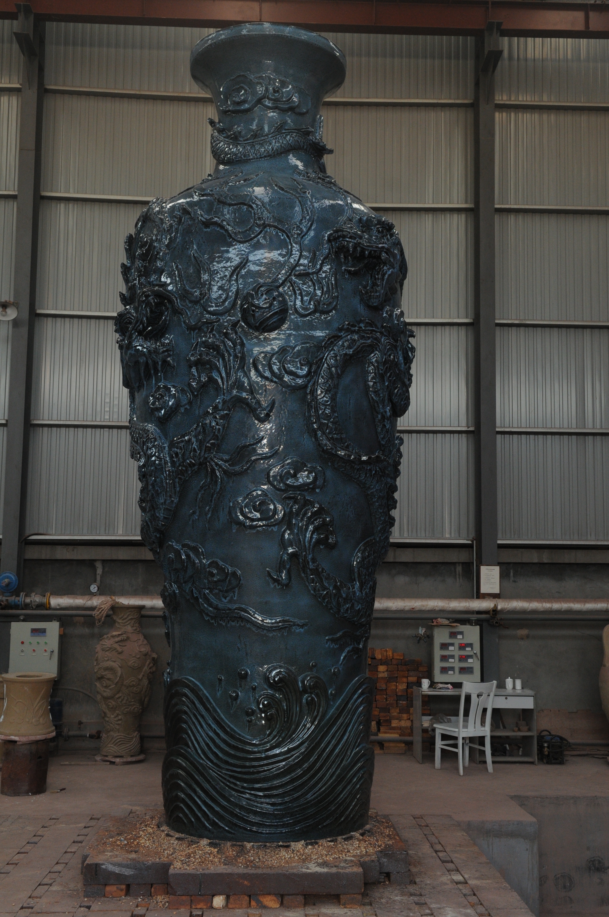 巨型陶瓷九龙瓶是由中国陶瓷设计艺术大师牛继伟设计制作的,瓶高从2.2米到7.5米不等,是大型园林陶瓷中的奇葩,获得基尼斯世界纪录,被誉为“中华龙瓶”,成为众多公园、单位、博物馆、小区等标志性装饰物。(张白拍摄)
