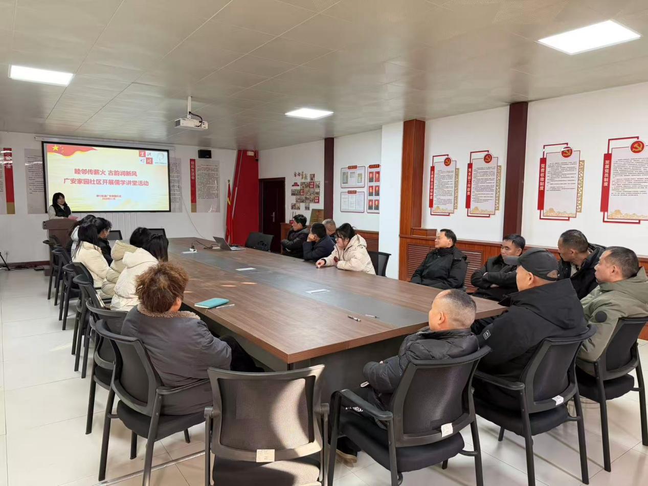 为弘扬中华优秀传统文化,促进社区和谐,1月12日,济宁高新区柳行街道广安家园社区开展了“睦邻传薪火,古韵润新风”儒学讲堂活动。