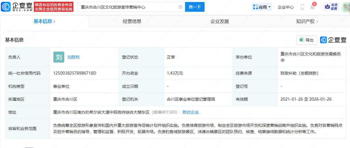 平台数据显示,“呆呆”账号近7日涨粉69117.3%,目前粉丝量已达42万。此外,当地文旅账号(合川文旅)也发出多条视频回应大家热情。企查查信息显示,合川文旅认证主体即重庆市合川区文化旅游宣传营销中心由重庆市合川区文化和旅游发展委员会举办。