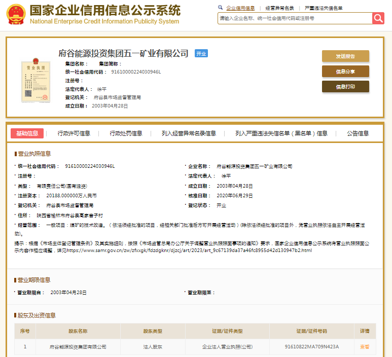 国家企业信用信息公示系统显示,府谷能源投资集团五一矿业有限公司成立于2003年,注册资本20188万元人民币,法定代表人徐平,由府谷能源投资集团有限公司全资持股。