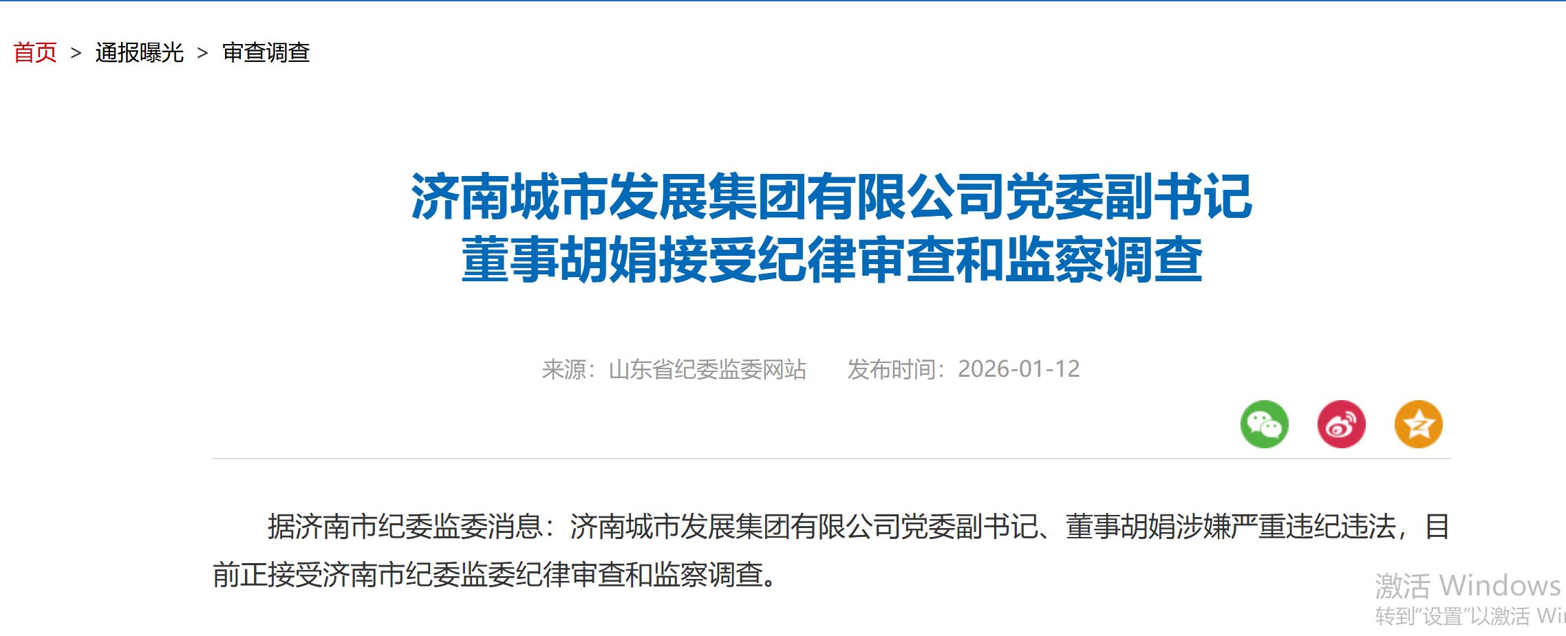 1月12日,山东省纪委监委网站通报,济南城市发展集团有限公司党委副书记、董事胡娟接受纪律审查和监察调查。据济南市纪委监委消息:济南城市发展集团有限公司党委副书记、董事胡娟涉嫌严重违纪违法,目前正接受济南市纪委监委纪律审查和监察调查。