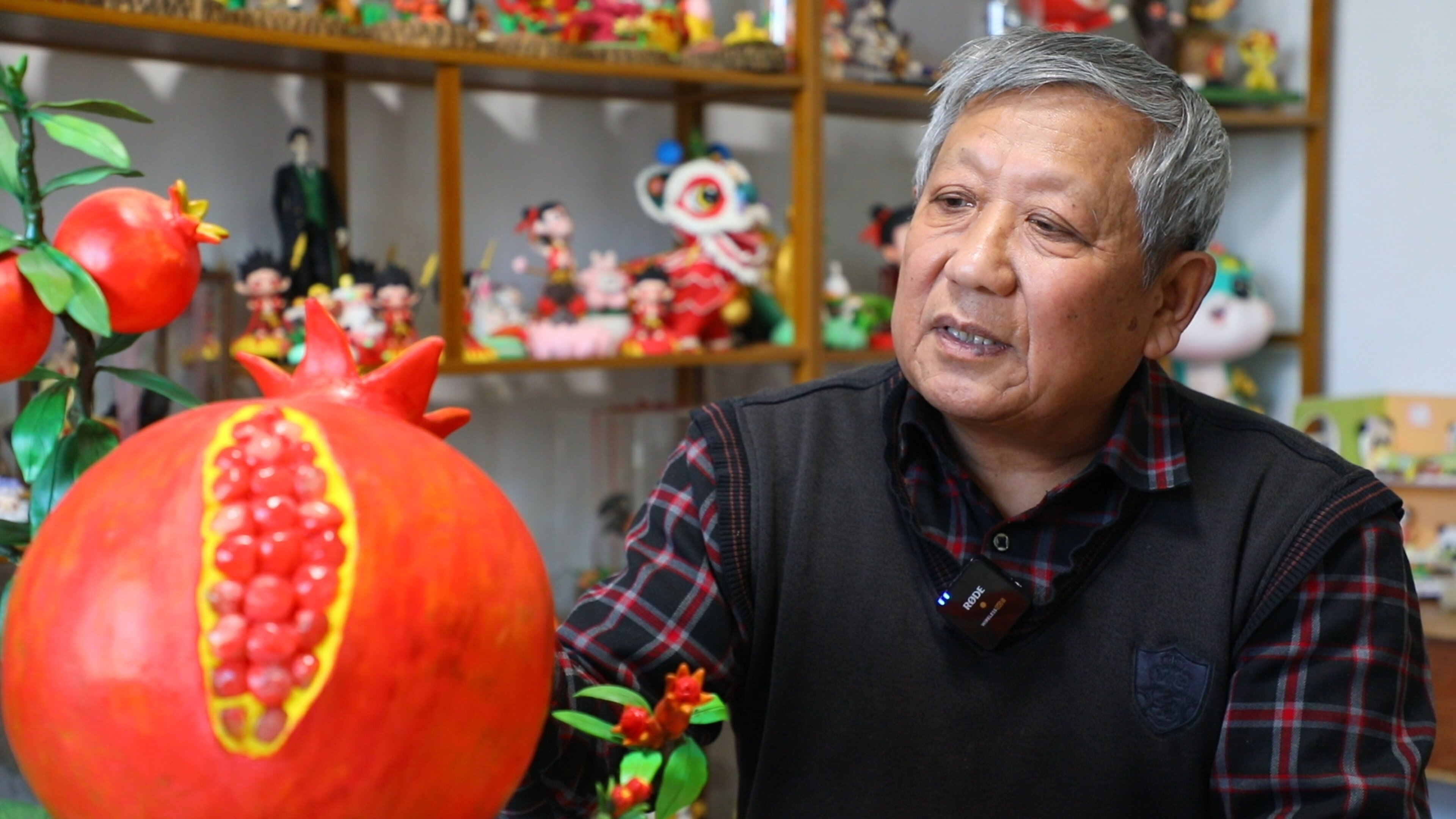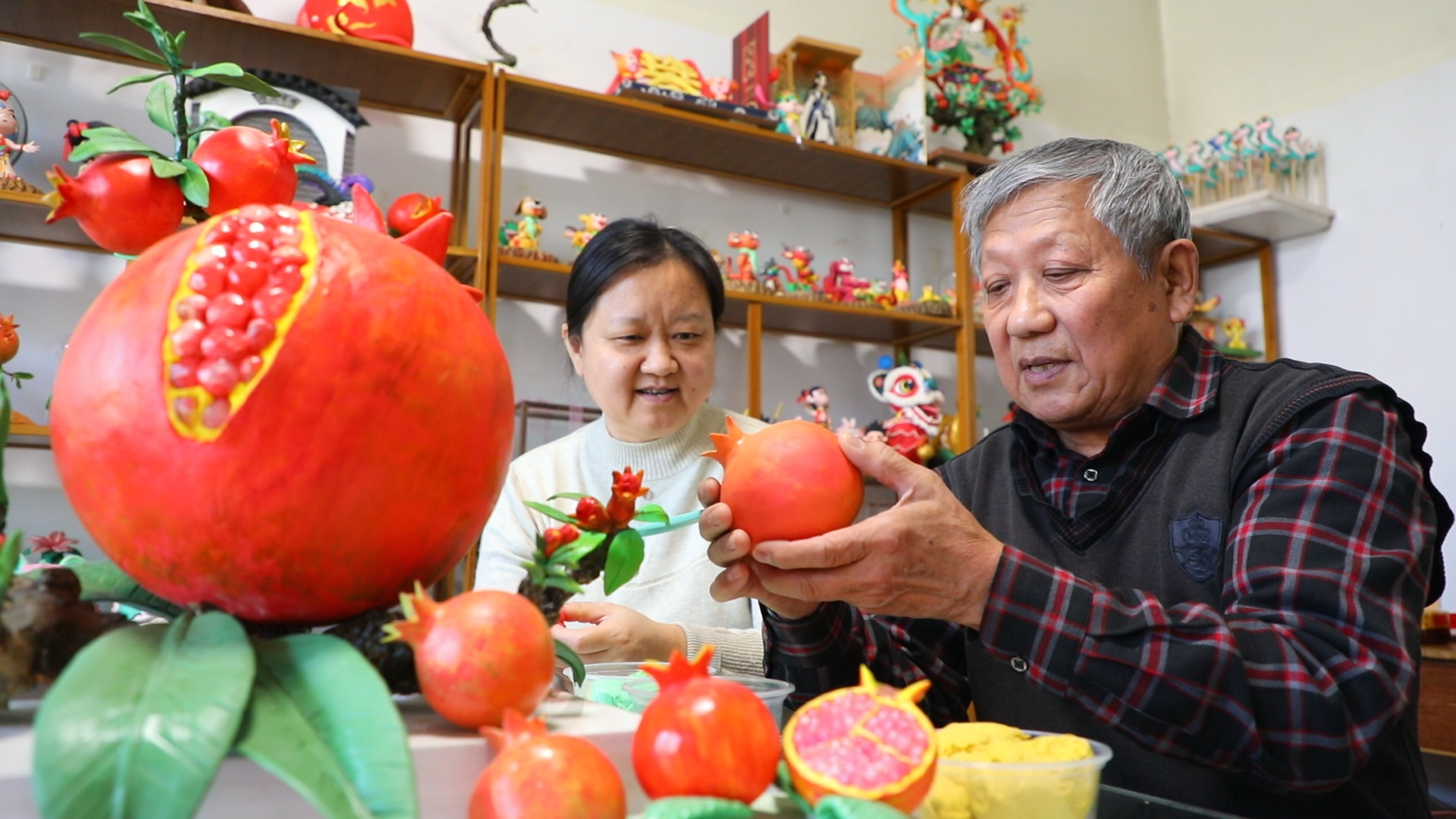 “这个石榴(面塑),我反复地做了得有5天,一点点地去把它的这个枝干,老枯树的形状都把它塑出来,这个石榴籽都是一粒一粒捏出来的。”枣庄市非遗项目“面泥塑传统手工技艺”代表性传承人阚宗勤说。