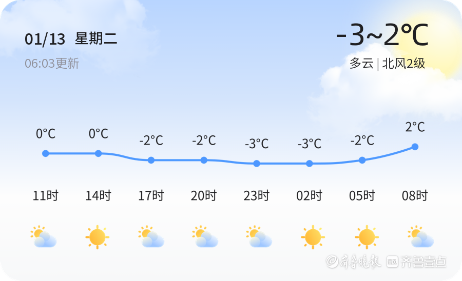 今天是1月13日,农历十一月廿五,星期二。烟台市天气多云,气温在-3℃至2℃之间,北风2级,空气湿度62%,空气质量良好(PM2.5为67)。市民出行时请注意保暖,建议佩戴口罩,防范呼吸道疾病。今天的天气总体适宜出行,但早晚温差较大,需注意添衣保暖。