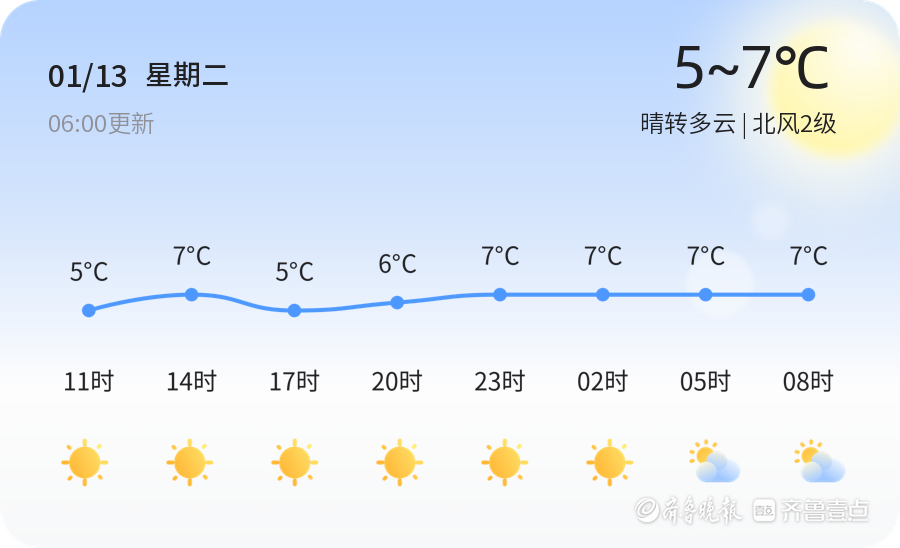 今天是2026年1月13日,星期二,农历十一月廿五。青岛市迎来了一天的晴转多云天气,气温适中,全市大部分地区最高气温为7℃,最低气温为5℃。今天早晨6点的实时温度为1.3℃,空气质量良好,PM2.5指数为95,风力较小,北风2级,空气湿度为57%。各区天气情况总体平稳,以晴转多云为主,适合市民户外活动。