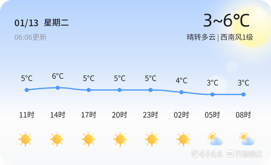 今天是2026年1月13日,星期二,农历十一月廿五。日照市今日天气晴转多云,气温在3℃至6℃之间,西南风1级,空气湿度为38%。空气质量状况为轻度污染(PM2.5指数104),建议敏感人群减少户外活动。市民出行时请注意保暖,适时增减衣物。当前温度为1.3℃,适合进行户外活动。风力较小,适合开窗通风。总体来说,今天的天气较为适宜市民出行和日常活动。 PM2.5指数为104,属于轻度污染,建议市民在户外活动时注意防护。 未来三天内,日照市天气将呈现晴到多云的变化趋势。14日和15日以晴到多云为主,16日转为多云天气。气温方面,14日气温将在0℃至6℃之间,15日气温有所上升,最高气温可达9℃,最低气温为1℃。风力方面,未来三天风力以3-4级为主,15日风力稍有减弱。特别提醒市民注意15日的天气变化,适时调整衣物,以免着凉。 17日将迎来一次小雨天气过程,气温有所下降,最低气温将达到-3℃,最高气温为11℃。18日天气转晴,但气温仍然较低,最低气温为-2℃,最高气温为6℃。19日天气再次转阴,伴有雨夹雪天气,市民出行时请注意防滑和保暖。未来一周内,日照市气温将呈现波动变化,市民出行时请注意关注天气变化,合理安排出行计划。总体来看,本周天气以晴到多云为主,偶有雨雪天气,市民出行时请注意防寒保暖,适时增减衣物。
