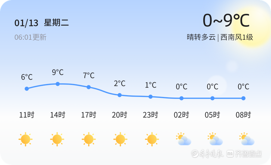 今天是2026年1月13日,星期二,农历十一月廿五。淄博市迎来晴转多云的天气,气温在0℃到9℃之间,西南风1级,空气湿度77%,空气质量指数为良。今天的天气较为适宜出行,但早晚温差较大,市民出行时请注意保暖,尤其是早晨和傍晚时段,建议添衣防寒。此外,空气质量良好,适合户外活动。