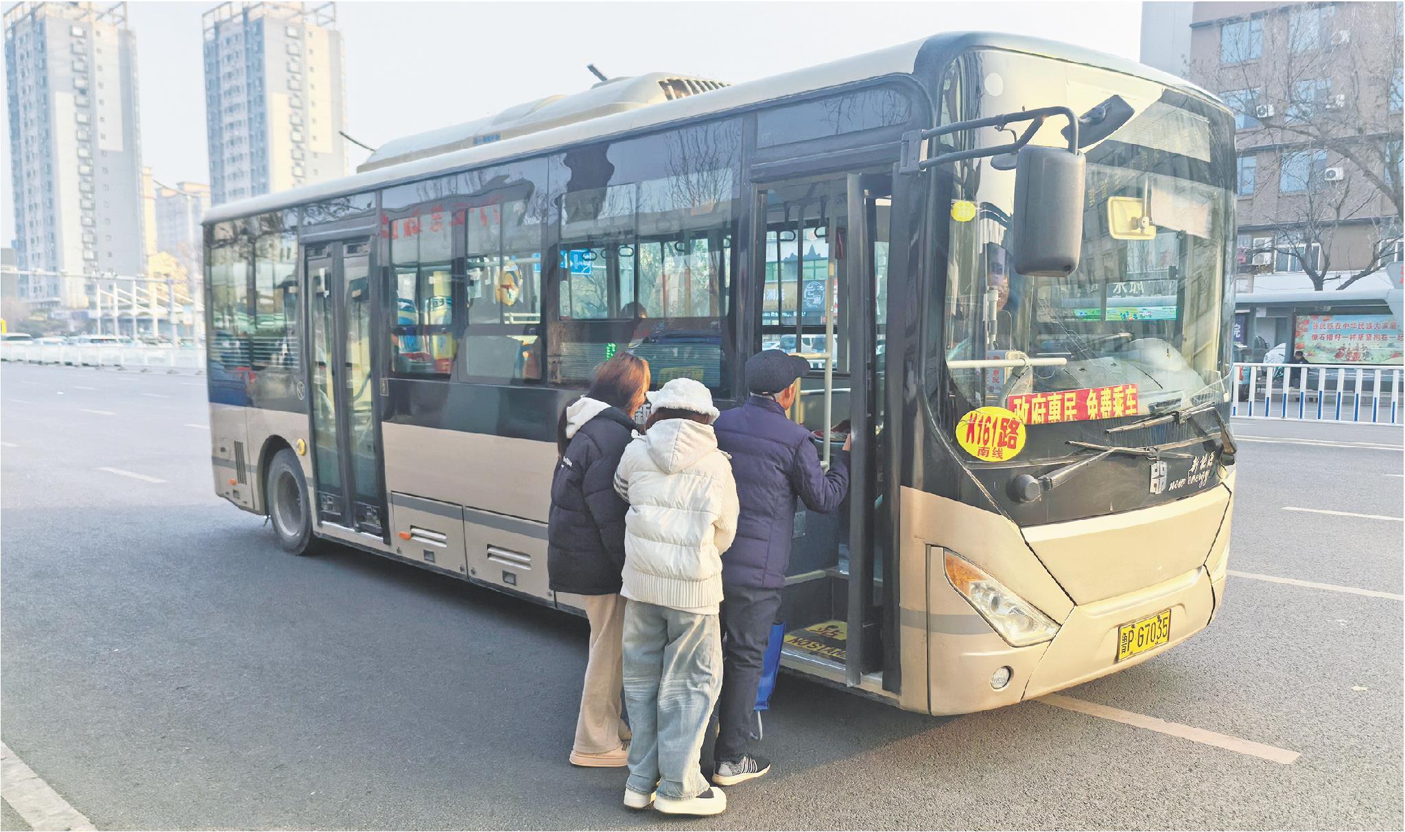 市民在聊城城区搭乘免费公交。(□记者张稳张旭侯晓报道)