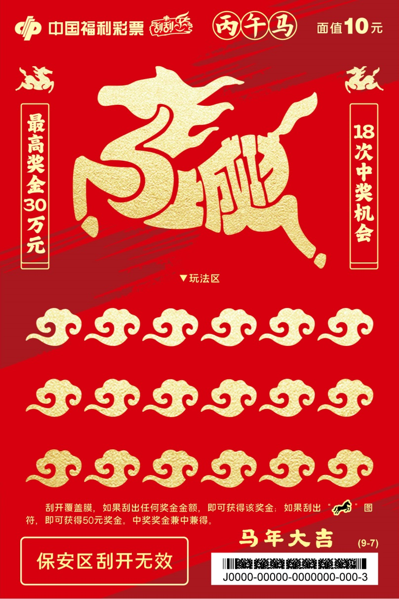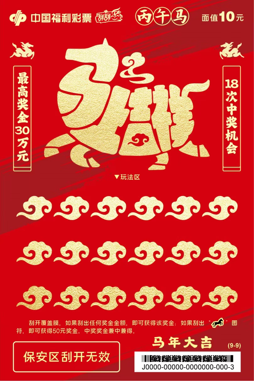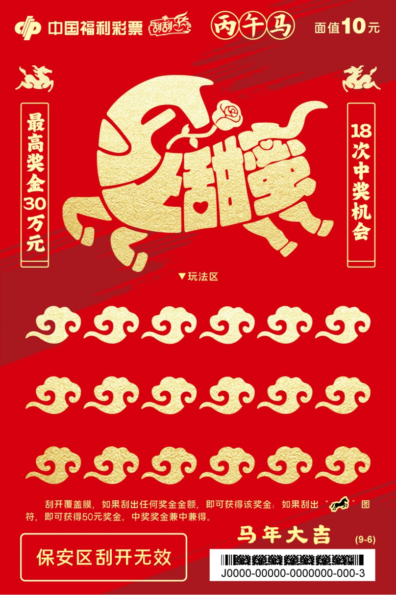 福运奔腾,马到成功!农历马年即将到来,“丙午马”生肖系列刮刮乐也即将在山东上市。该系列彩票共有5元、10元、20元、30元、50元五款游戏,既传承民俗文化,又表达美好祝福。