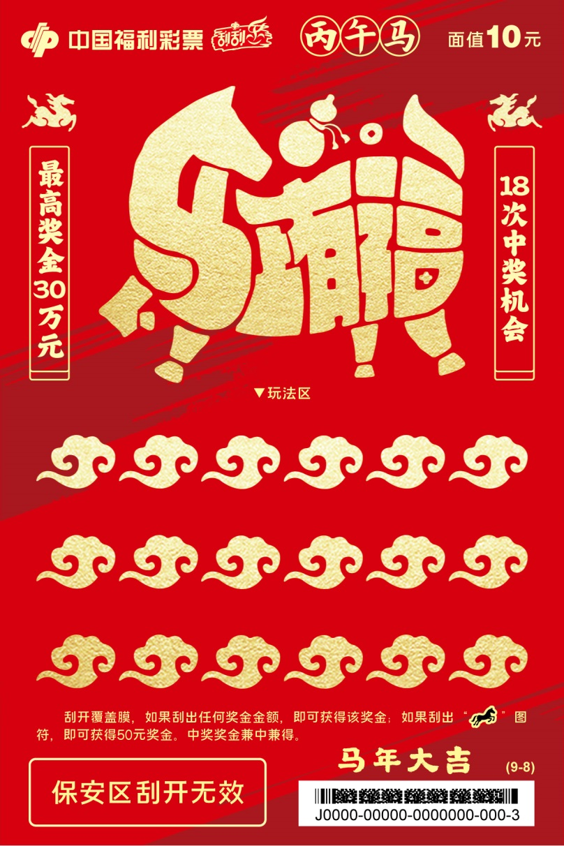 九张票面分别以马上走运、马上平安、马上美满、马上开心、马上顺意、马上甜蜜、马上成功、马上有福、马上吉祥为主题,烘托生肖贺岁的吉祥氛围,承载满满马年祝福。刮开覆盖膜,如果刮出任何奖金金额,即可获得该奖金;如果刮出“骏马”图符,即可获得50元奖金。中奖奖金兼中兼得。最高奖金30万元,共18次中奖机会。
