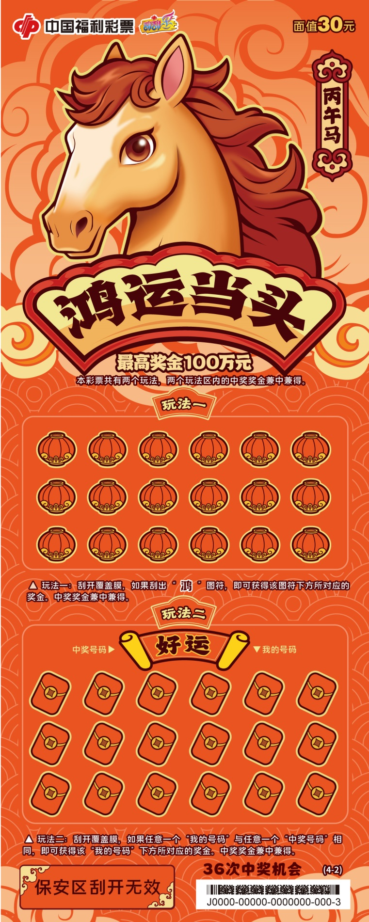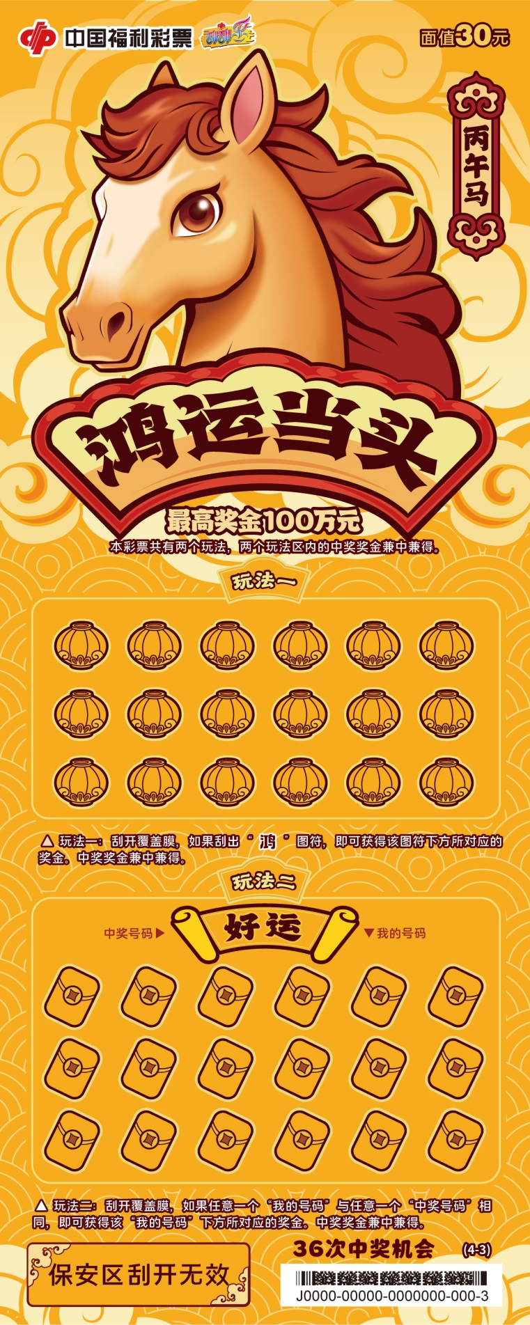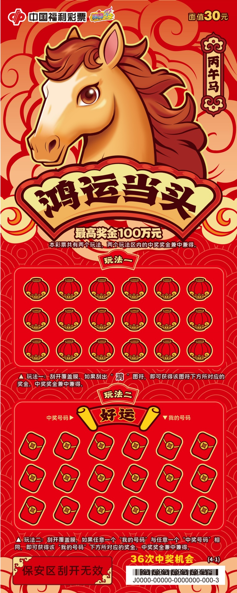 四张票面以马头为设计主题,祝福购彩者在新的一年里鸿运当头,好运连连。本套彩票共有两个玩法,两个玩法区内的中奖奖金兼中兼得。玩法一:刮开覆盖膜,如果刮出“鸿”图符,即可获得该图符下方所对应的奖金,中奖奖金兼中兼得。玩法二:刮开覆盖膜,如果任意一个“我的号码”与任意一个“中奖号码”相同,即可获得该“我的号码”下方所对应的奖金,中奖奖金兼中兼得。最高奖金100万元,共36次中奖机会。