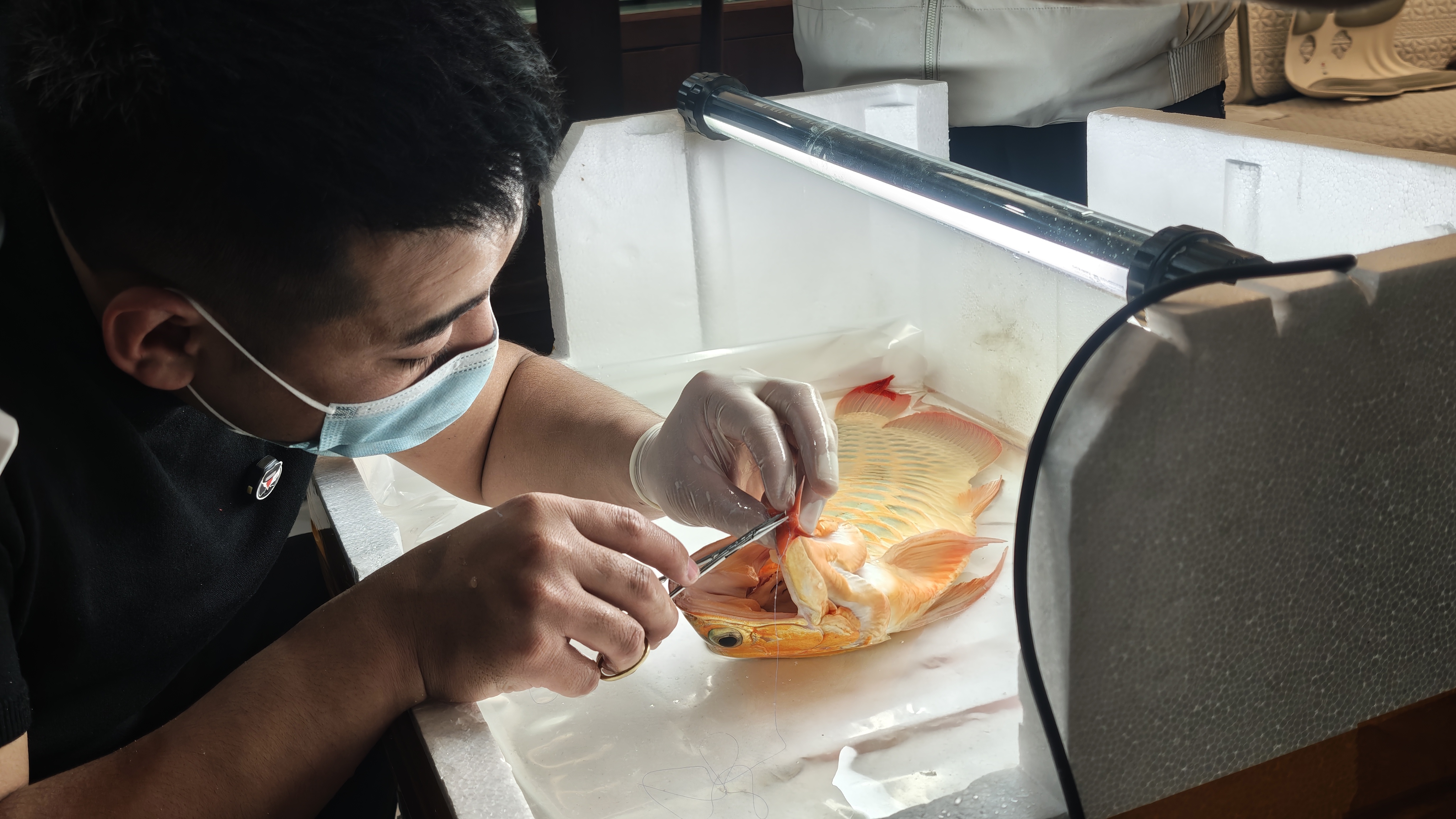 “我们做的手术主要分七大类,核心是兜嘴、掉眼、翻鳃修复,还有修须子、整尾鳍、取异物等。”高云鹏介绍。