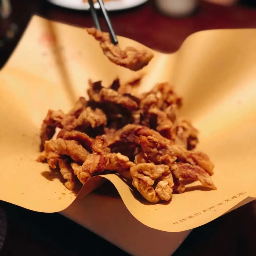 出锅沥干油后,焦黄酥脆的炸肉上粘着均匀的花椒面,咬一口,薄薄的面皮酥脆,质嫩的肉滋味十足,配上微麻的花椒面,香而不腻,咸香味美,真是回味无穷!