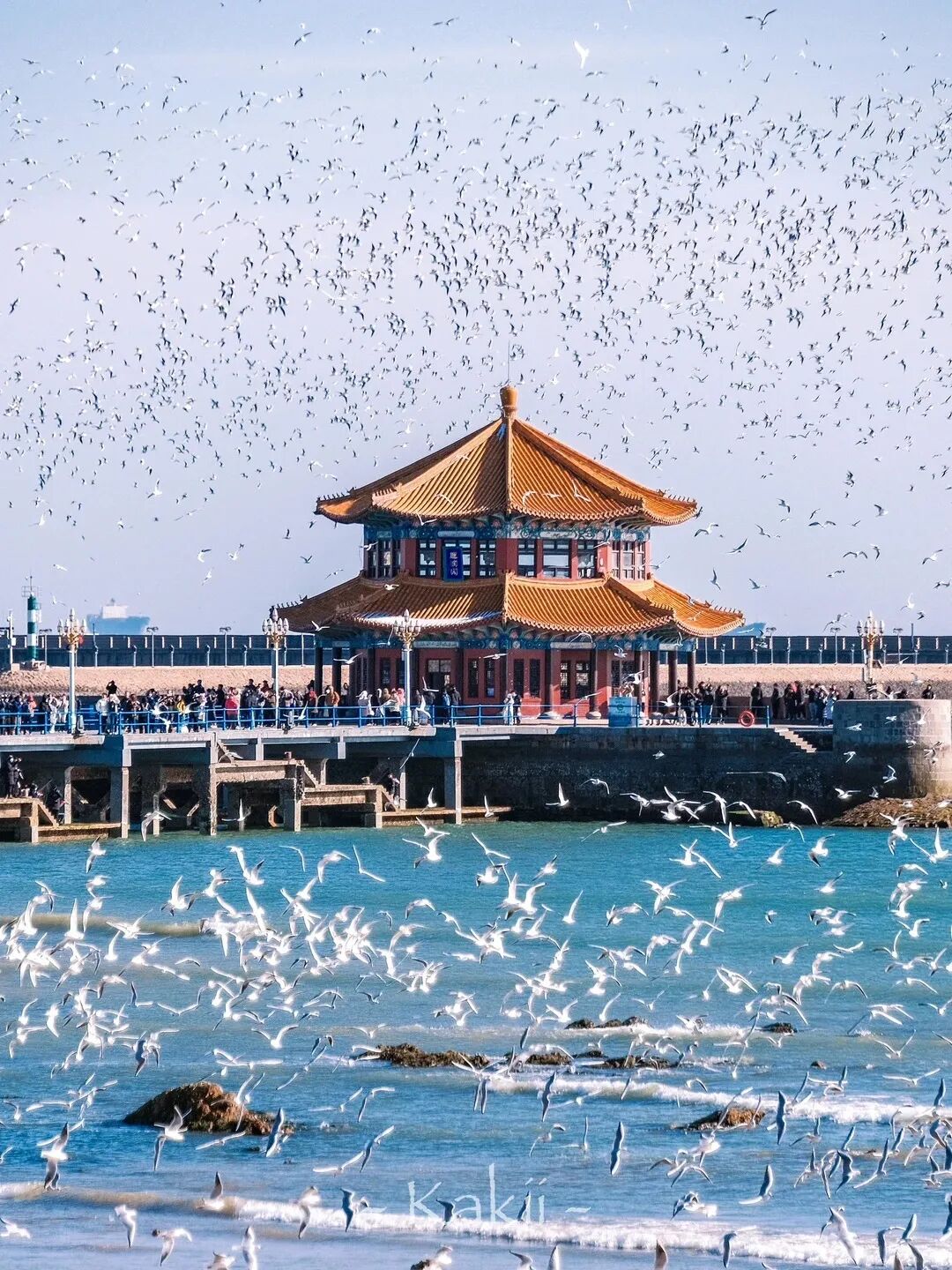 追随白色精灵,收获一整片海的浪漫。在栈桥,成群的鸥鸟环绕身侧,亲手投喂、捕捉它们翱翔的灵动瞬间。沿着海岸线漫步,从鲁迅公园的红礁石到八大关的静谧街景,冬日的海显得格外深邃宁静。