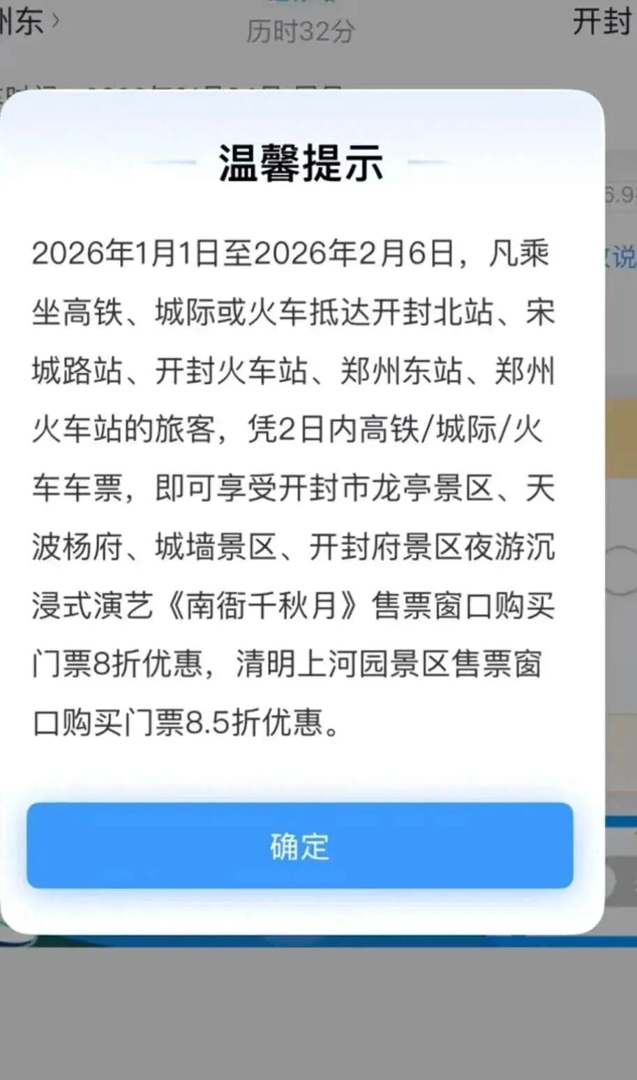2026年1月1日至2026年2月6日,凡乘坐高铁、城际或火车抵达开封北站、宋城路站、开封火车站、郑州东站、郑州火车站的旅客,凭2日内高铁/城际/火车车票,即可享受开封市龙亭景区、天波杨府、城墙景区、开封府景区夜游沉浸式演艺《南衙千秋月》售票窗口购买门票8折优惠,清明上河园景区售票窗口购买门票8.5折优惠。