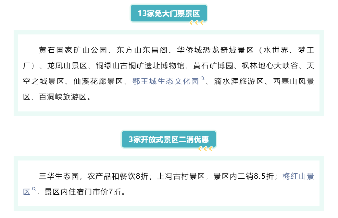 2026年全年(部分假期除外),湖北黄石13家景区向湖南永州居民免票,另有3家开放式景区推出二消优惠。
