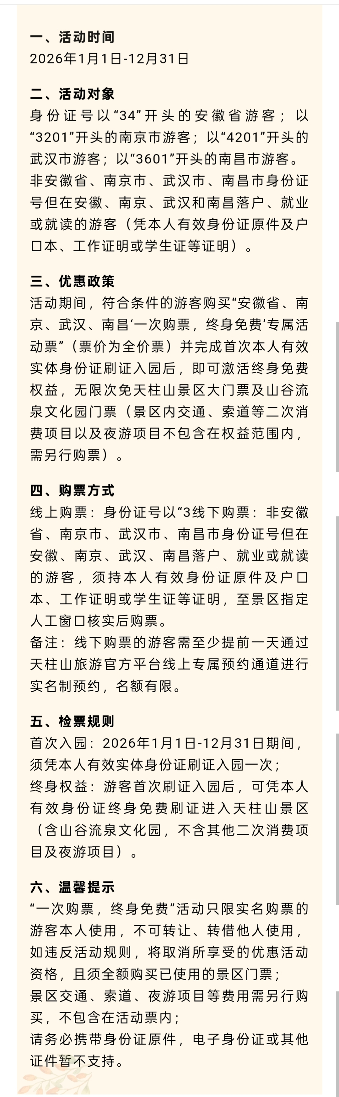 一次购票,终身免费!1月8日,安徽天柱山风景区面向安徽省全域、江苏省南京市、湖北省武汉市、江西省南昌市的游客发布购票优惠政策。