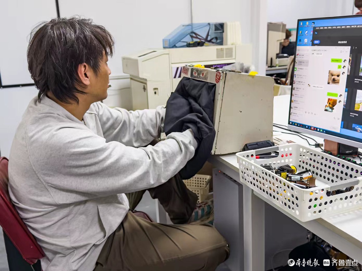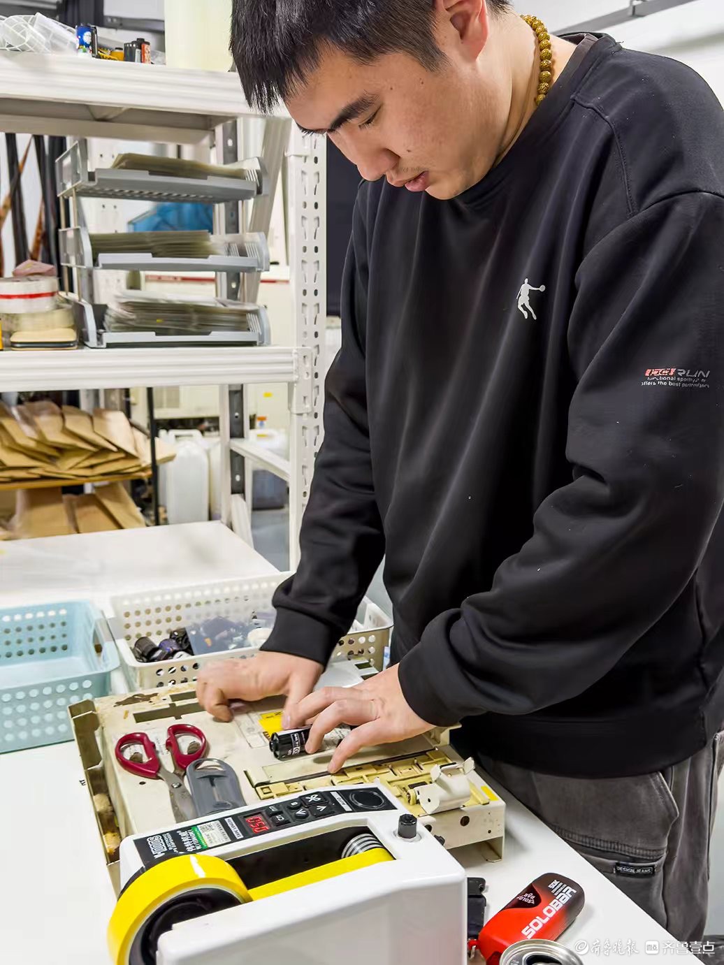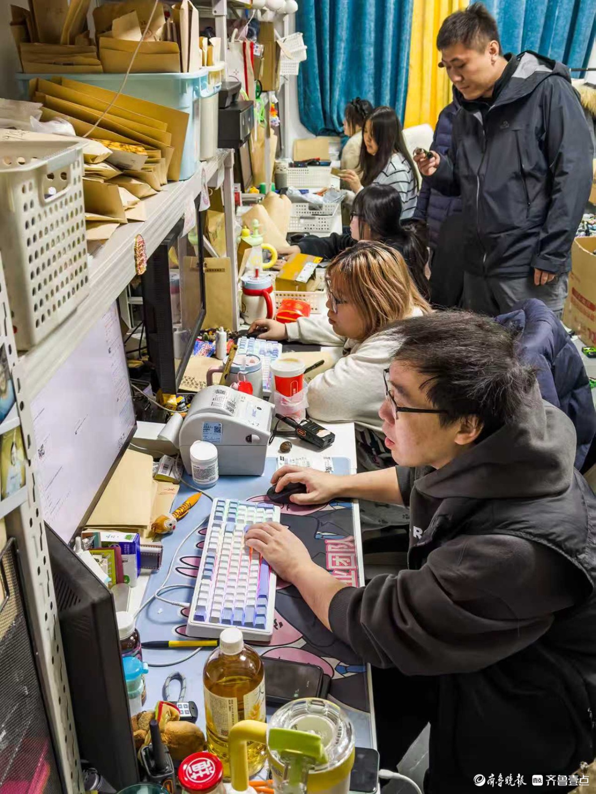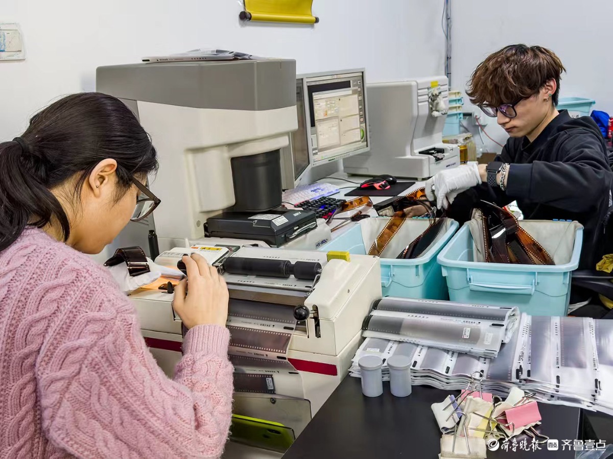1月7日,在济南生产西路的菲林实验室内,桌台与货架被胶片设备和纸箱填满,有人守着电脑处理订单,有人戴着手套整理成卷的胶片,有人操作仪器进行胶片转档。这些棕褐色的胶片在忙碌的双手间流转,旧载体里的影像正以新的方式被留存传递。王剑摄